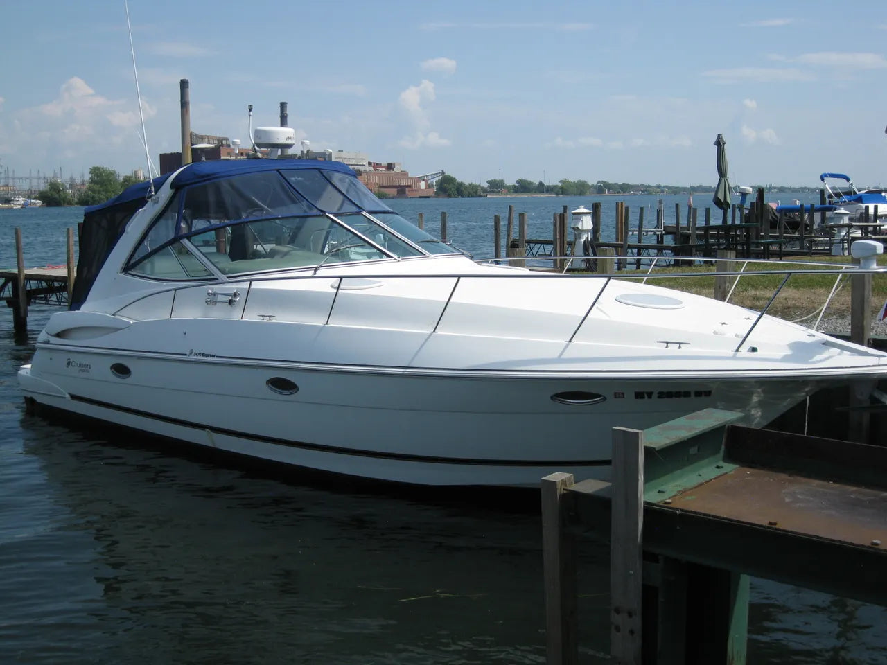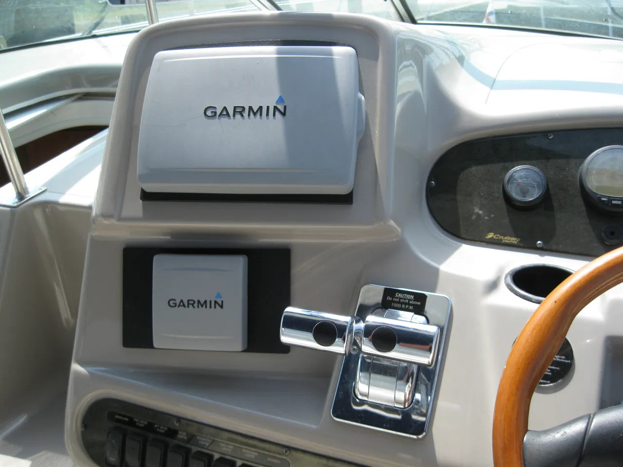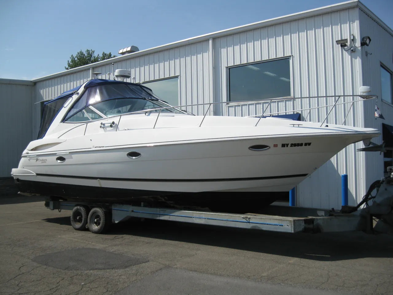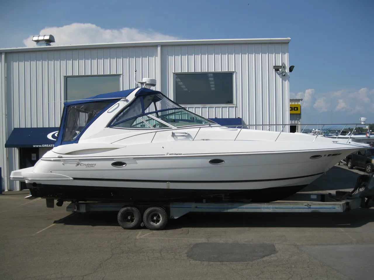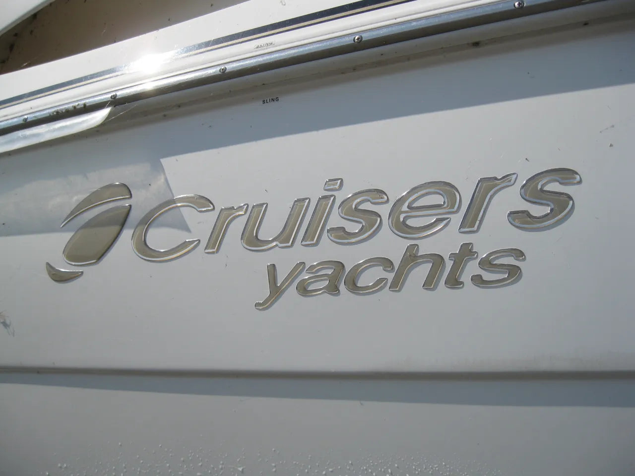 2003 Cruisers 2470 Express. 100% Freshwater boat, extremely well cared for. Powered by twin Mercruiser 8.1 Horizon V Drives at 370hp each, with only 735hrs of freshwater runtime. Kohler 60hz generator with 210hrs. Large swim platform leads into a portside walkthrough that boasts cockpit fridge and sink, horseshoe group seating with large table, and passenger lounger. Double wide helm station w/ flip bolsters, Mercury Smartcraft gauges, Garmin GPSmap 5208 paired with GHC 10 autopilot, VHF radio, freshly updated canvas with screens. Cabin entry leads into portside kitchen with fridge, stovetop, and microwave, houesd by cherry wood cabinets, full bathroom with individual shower stall, large wood kitchen dinette table, spacious aft cabin, and master berth with TV, and large closet space. Anchor windlass and remote spotlight. Must see to appreciate.