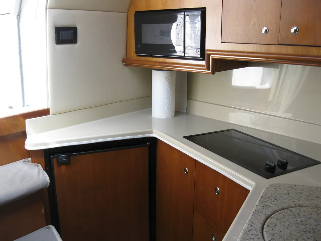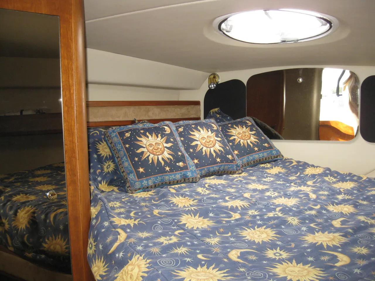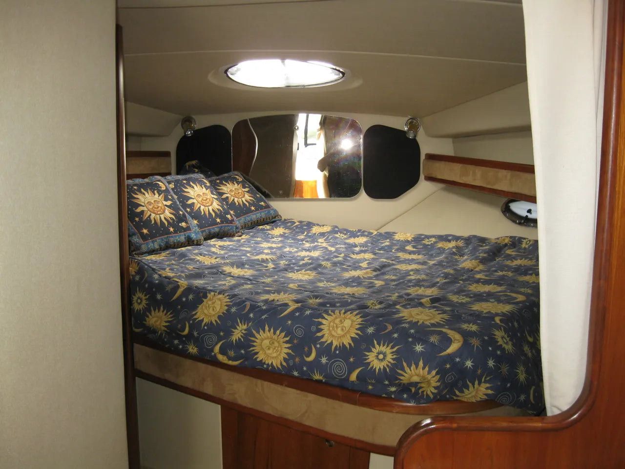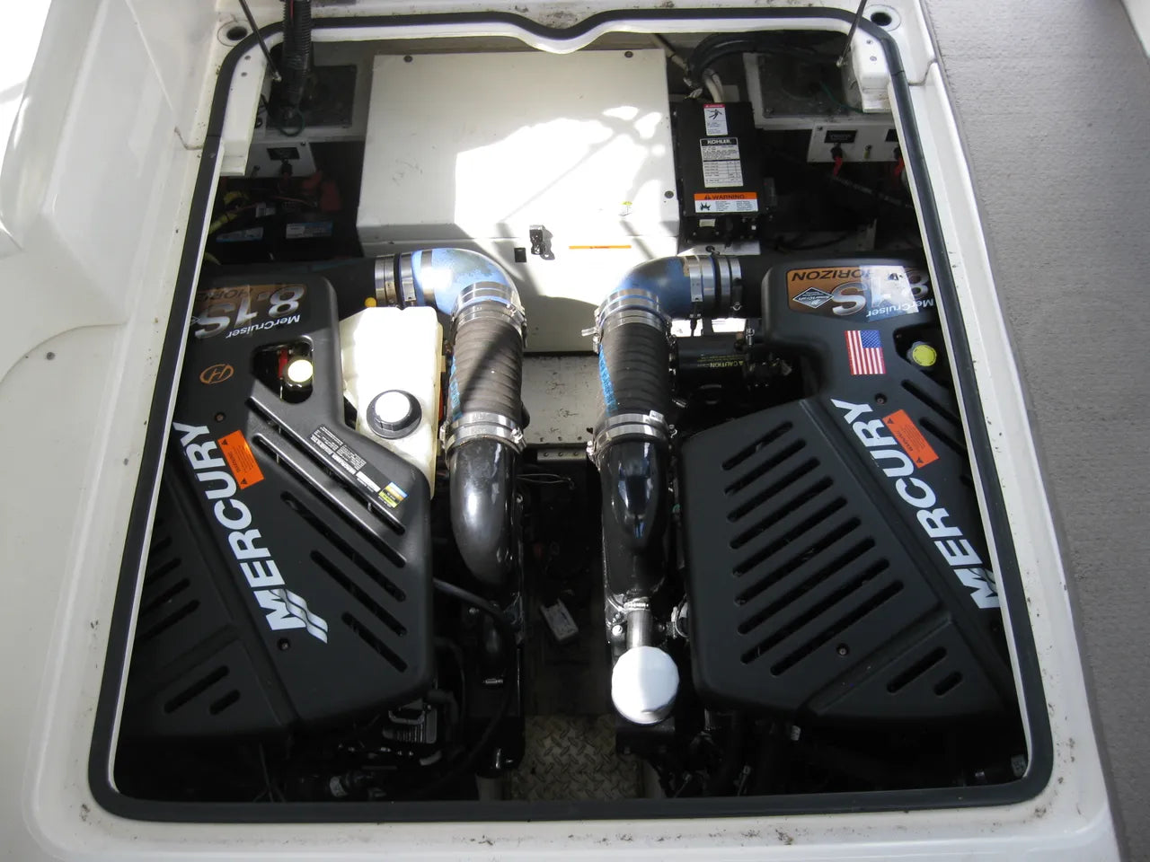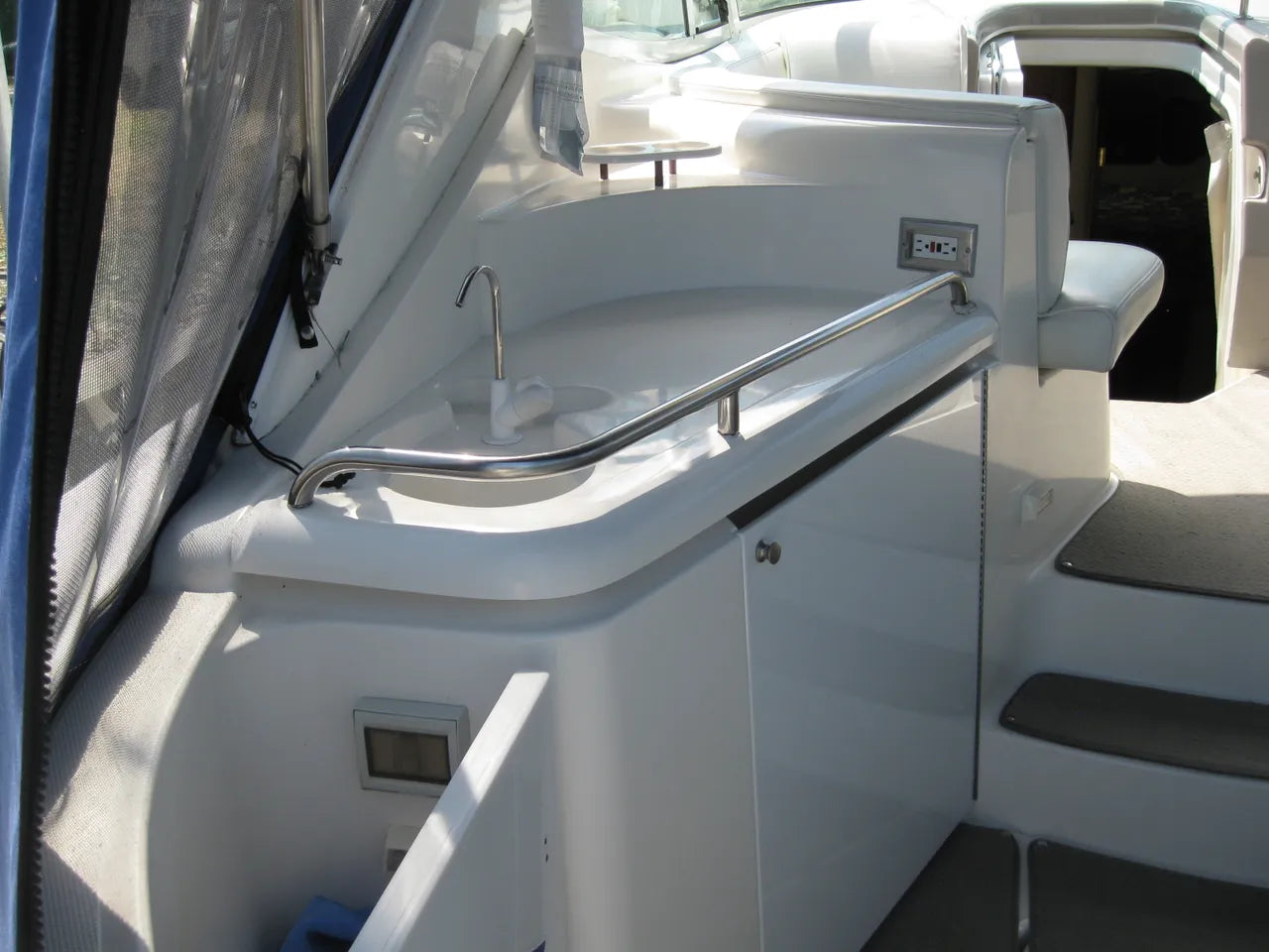 2003 Cruisers 2470 Express. 100% Freshwater boat, extremely well cared for. Powered by twin Mercruiser 8.1 Horizon V Drives at 370hp each, with only 735hrs of freshwater runtime. Kohler 60hz generator with 210hrs. Large swim platform leads into a portside walkthrough that boasts cockpit fridge and sink, horseshoe group seating with large table, and passenger lounger. Double wide helm station w/ flip bolsters, Mercury Smartcraft gauges, Garmin GPSmap 5208 paired with GHC 10 autopilot, VHF radio, freshly updated canvas with screens. Cabin entry leads into portside kitchen with fridge, stovetop, and microwave, houesd by cherry wood cabinets, full bathroom with individual shower stall, large wood kitchen dinette table, spacious aft cabin, and master berth with TV, and large closet space. Anchor windlass and remote spotlight. Must see to appreciate.