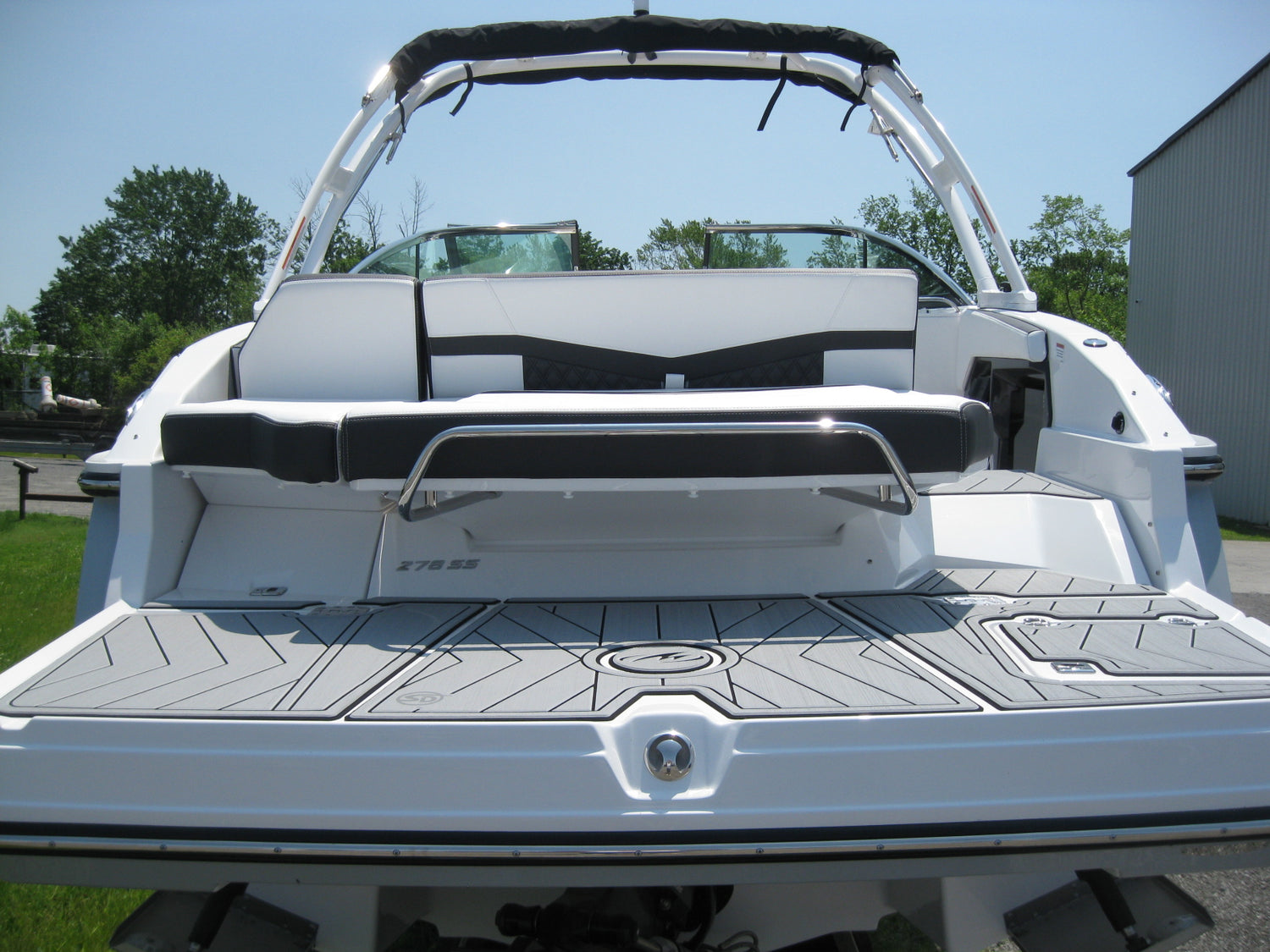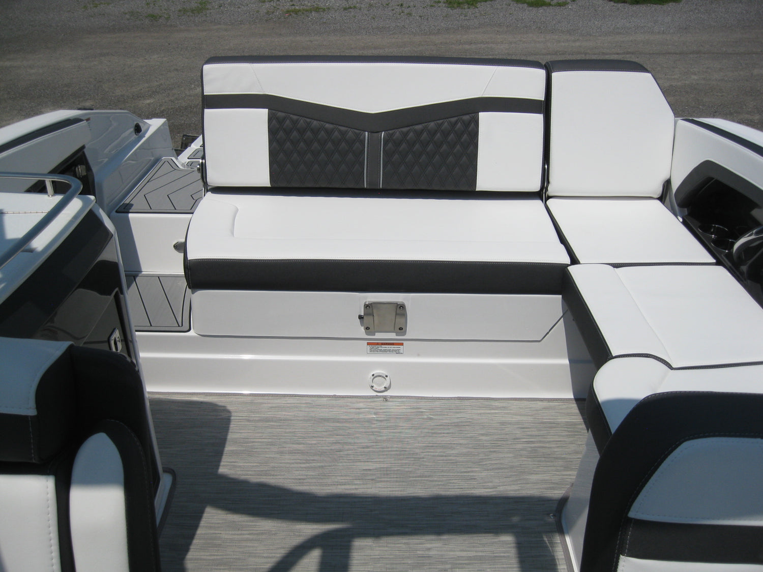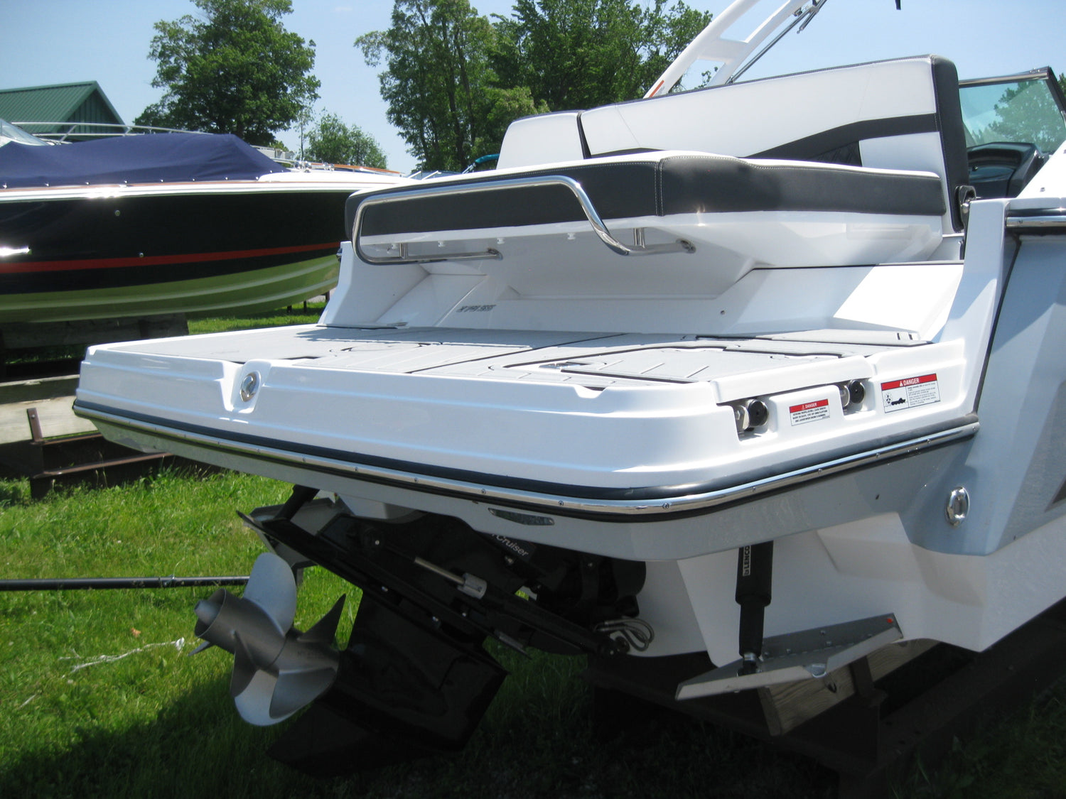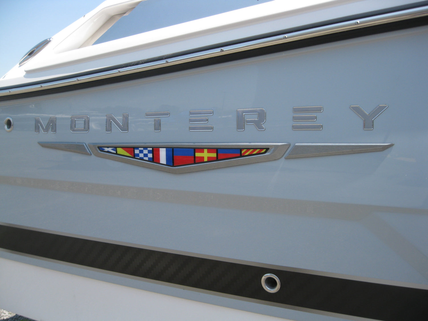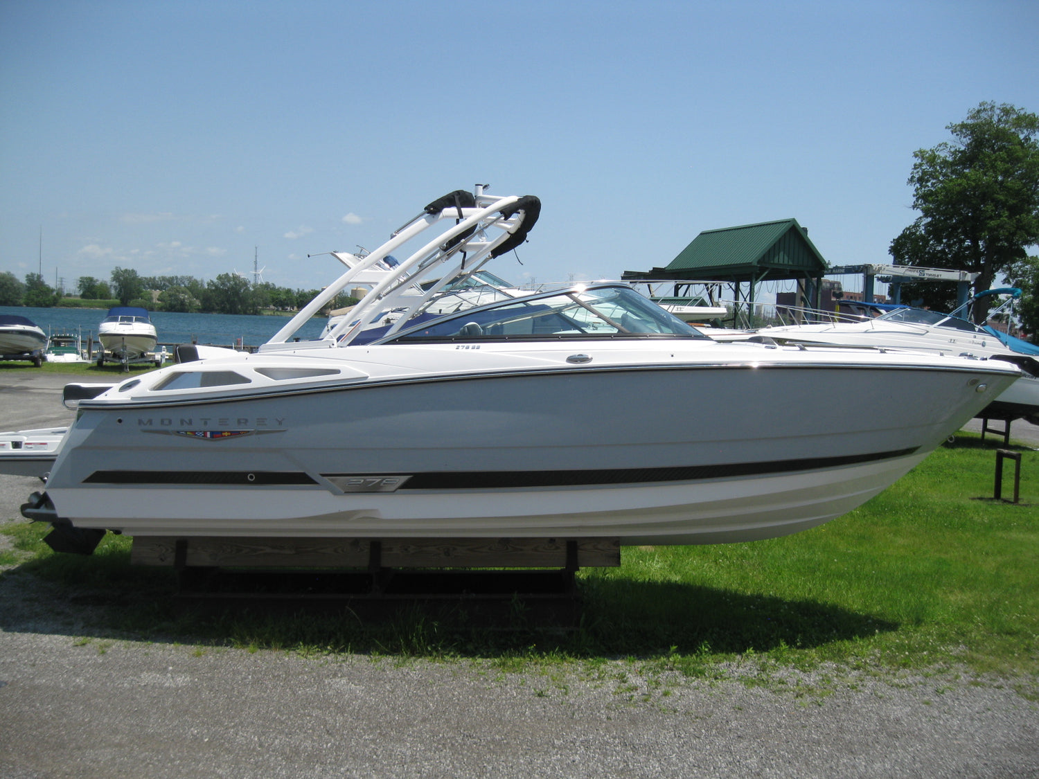 2025 Monterey 278 SS. Very popular boat for the Great Lakes, this 278 Super Sport is powered by a Mercury 6.2L 350hp w/ DTS and paired with a Bravo III Drive. Whisper gray hullside color, arctic bottom, collapsable white wakeboard tower w/ integrated bimini top, anthracite upholstery, anchor windlass, SeaDek swim platform inlay, cockpit table, cockpit galley w/ wetbar and sink, snap out woven flooring, pumpout head, bow & cockpit covers, and more.
