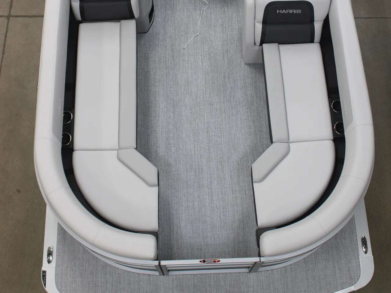 2026 Harris Cruiser 230 SLDH Tri-Toon. SLDH (single flip lounger w/ dual helm captains chairs) matte black side panels, powered by a Mercury 150hp 4 stroke with RPM 325 Chasis Performance Tri-Toon Package, stainless steel prop, hydraulic steering, tungsten interior fabric, stone grey woven flooring (no carpet) digital depth finder, dual UltraLux high back recliners, Wetsounds speakers, convenience pkg, wireless phone charger, individual seat covers, changing room w/ curatin, luxury sport table upgrade.