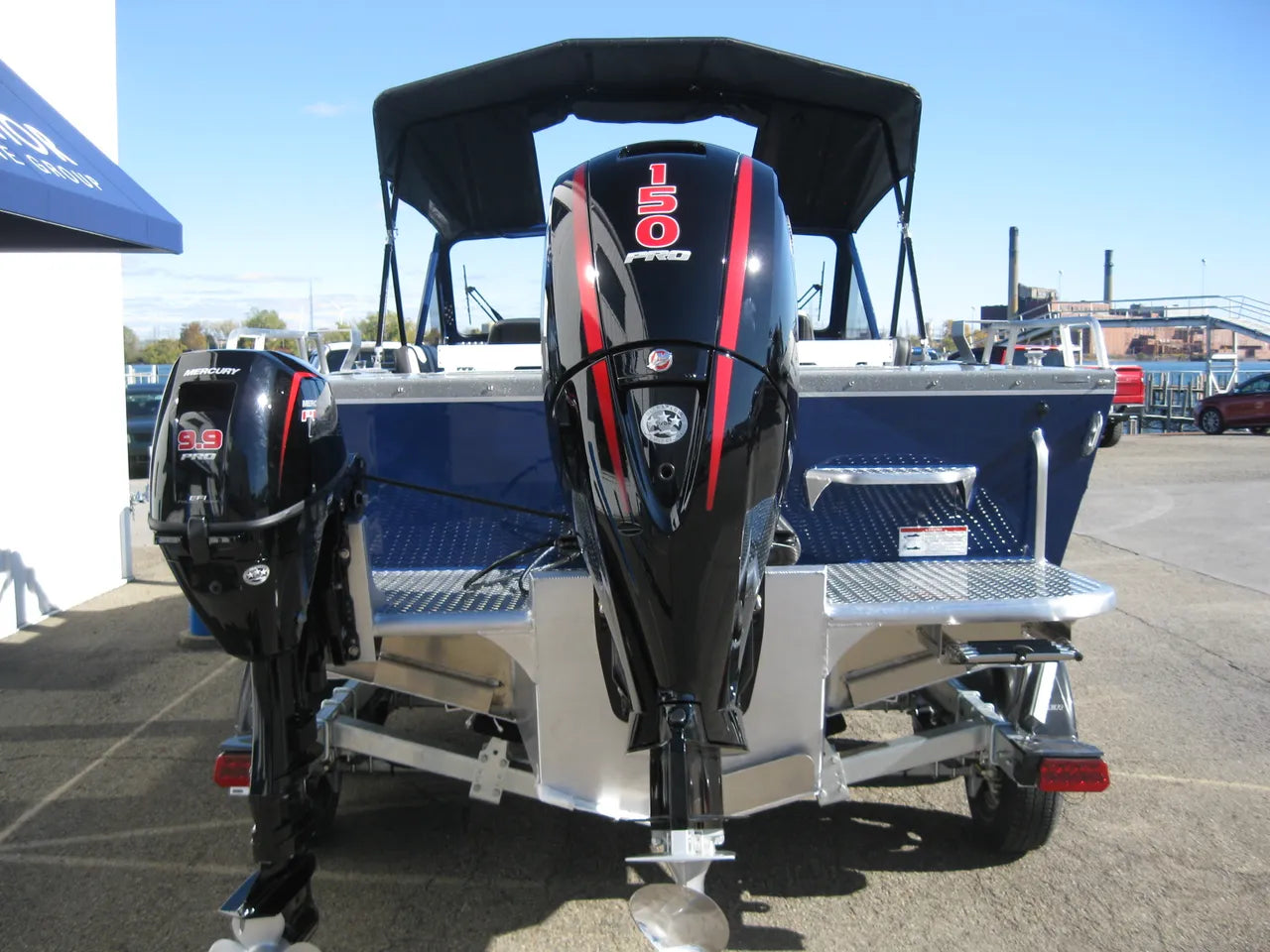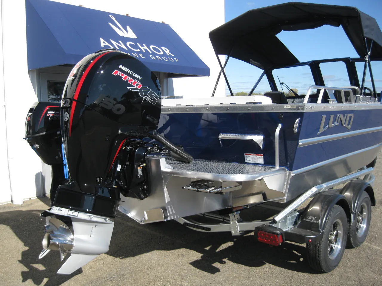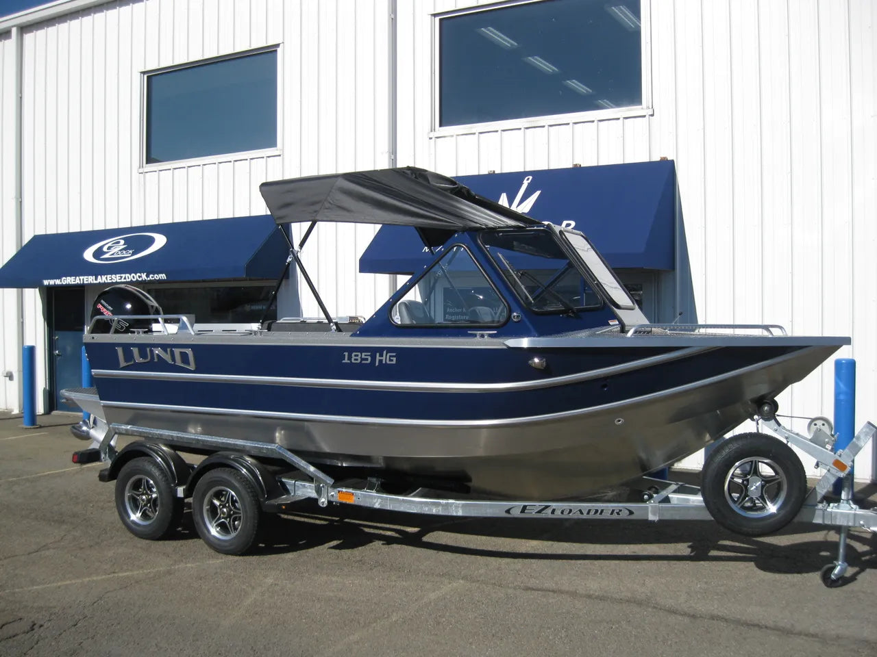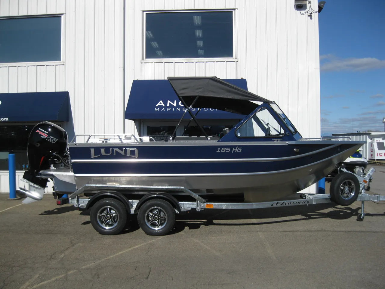 2026 Lund 185 HG. The all new Heavy Gauge is here, perfect big water fish boat. The 185 HG is powered by a Mercury 150 Pro XS 4 stroke paired with a 9.9 EFI Pro Kicker equipped with tie bar and remote, full vinyl flooring, dual smooth move seats w/ adjustable armrests, new Navy blue hullsides w/ chrome raised logos, 6" stern rails w/ welded downrigger mounting pads port and starboard, LED docking lights, dual automatic bilge pumps, raw water washdown, sport top that connects to windshield with side isinglass wings and stern cover, and comes complete w/ an EZ Loader tandem galvanized trailer w/ spare tire and load guides.