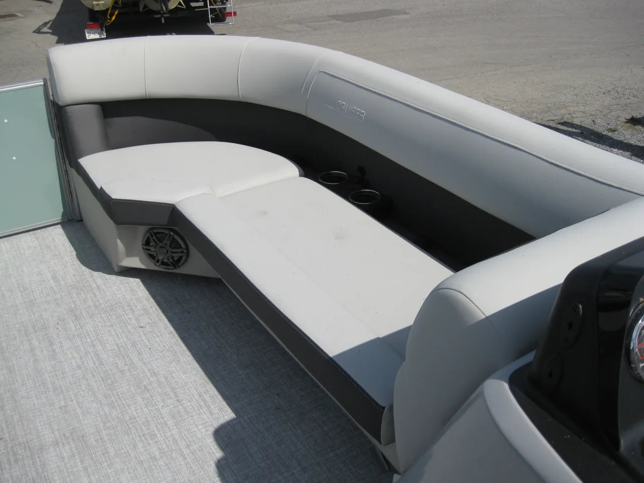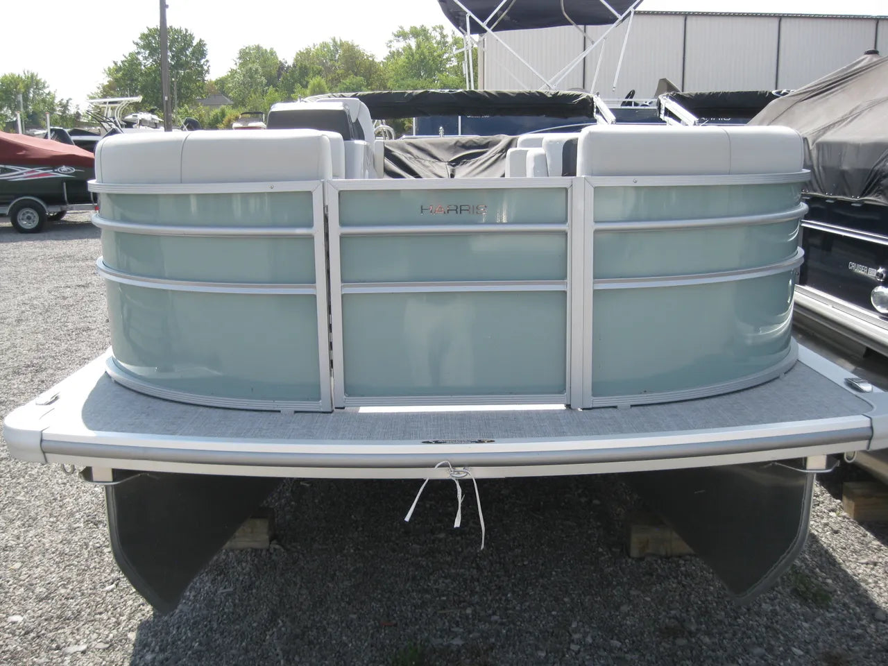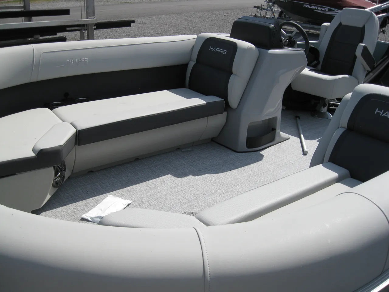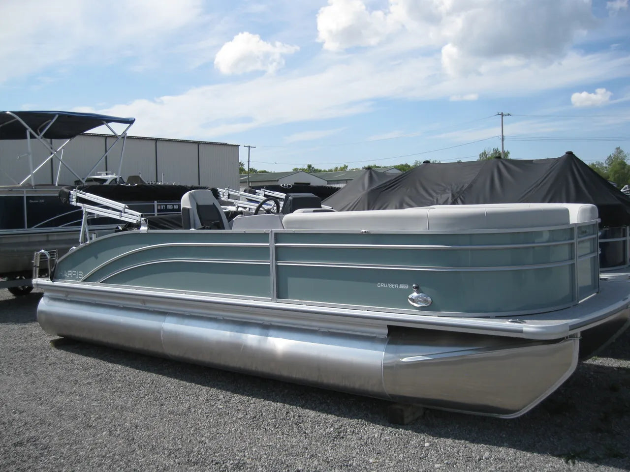 2024 Harris Cruiser 230 SL Pontoon, powered by a 115 Mercury Command Thrust. Sage green side panels, full stone grey seagrass flooring, ski tow bar, Clarion bluetooth stereo, full keel w/ lifting strakes, xtreme tilt steering, quick release fenders, battery disconnect switch, changing room, helm Ultralux recliner, Lowrance fish / depth finder, docking lights, flip up cleats, table upgrade, and snapless cover.