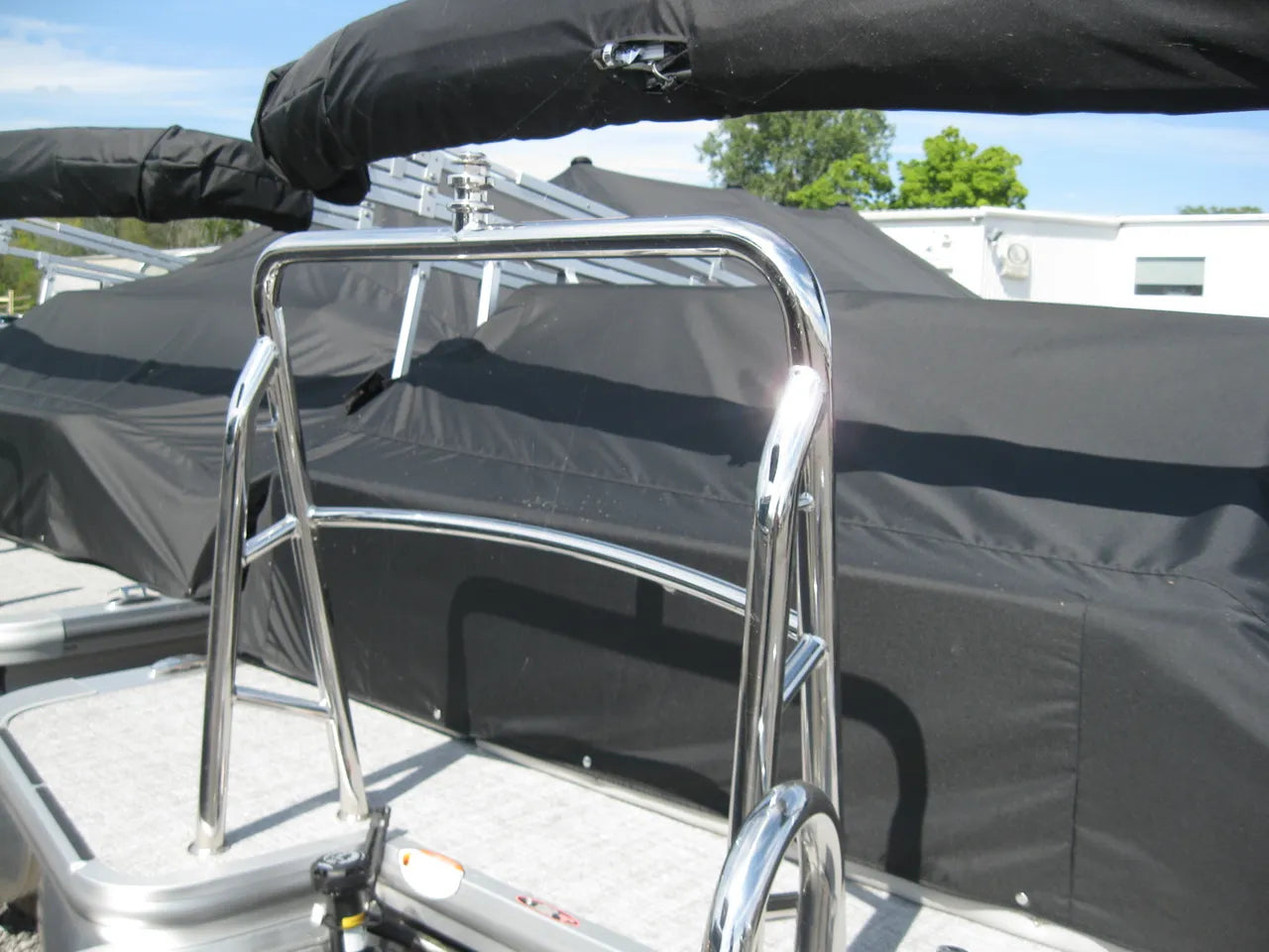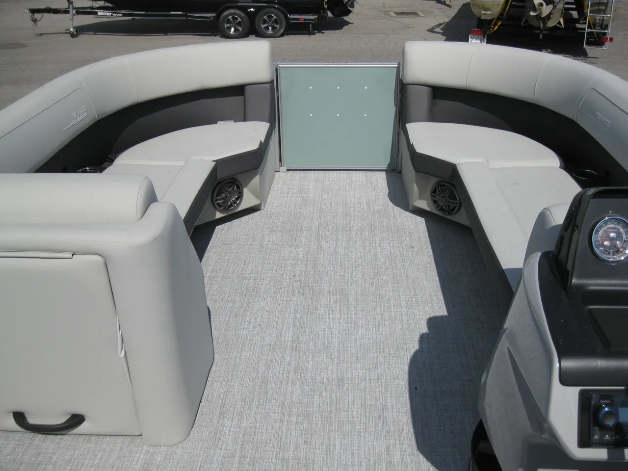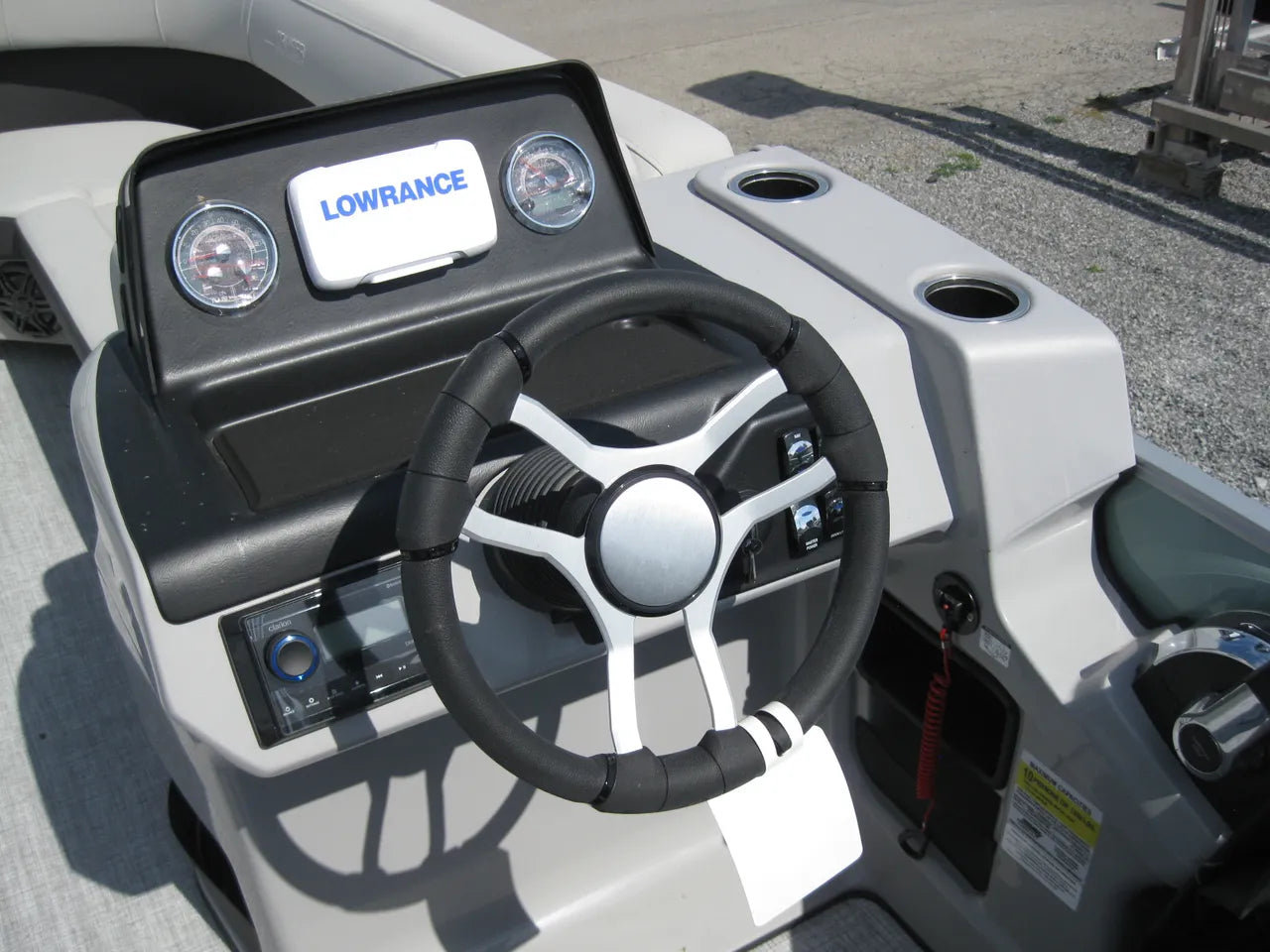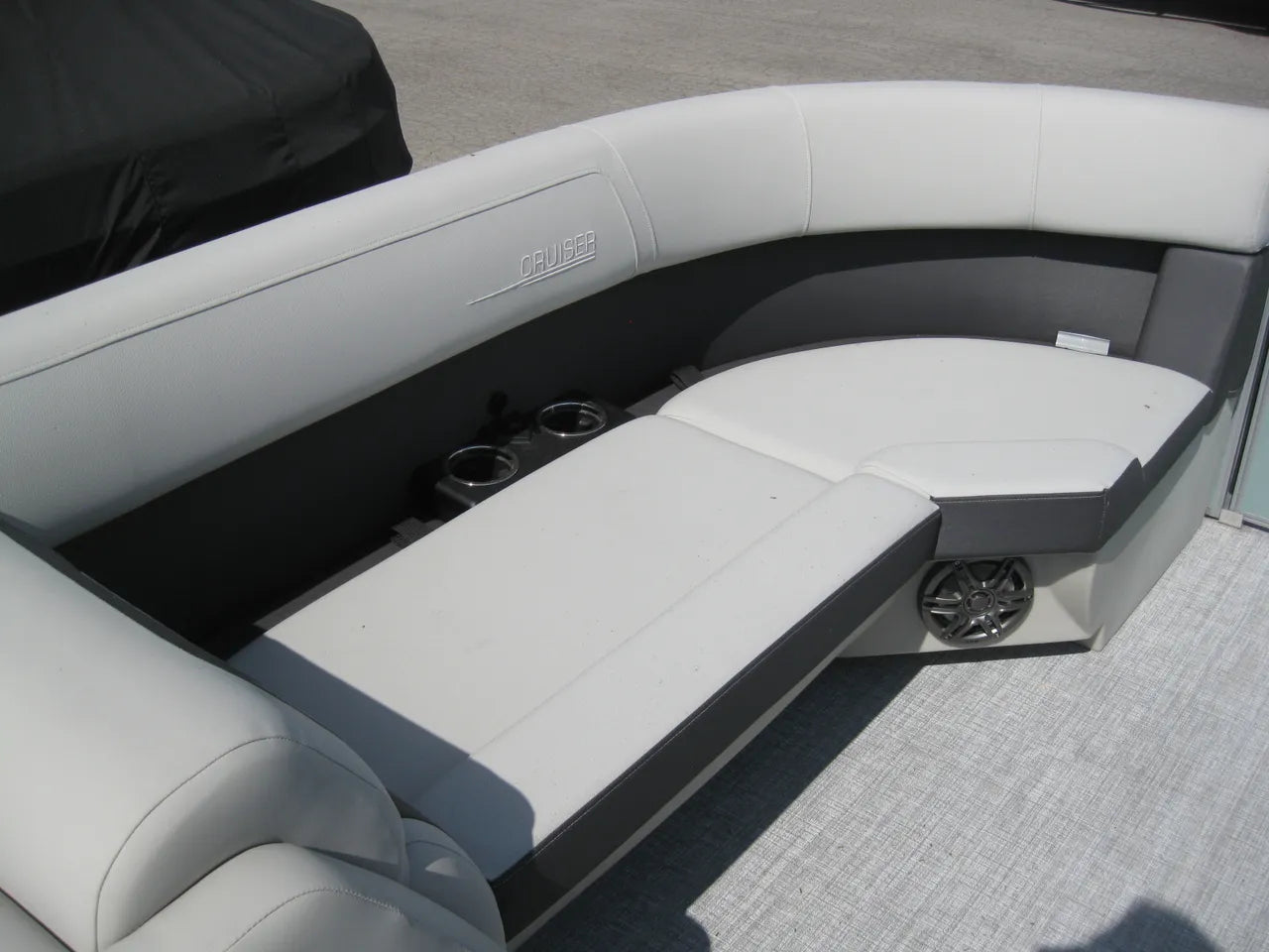 2024 Harris Cruiser 230 SL Pontoon, powered by a 115 Mercury Command Thrust. Sage green side panels, full stone grey seagrass flooring, ski tow bar, Clarion bluetooth stereo, full keel w/ lifting strakes, xtreme tilt steering, quick release fenders, battery disconnect switch, changing room, helm Ultralux recliner, Lowrance fish / depth finder, docking lights, flip up cleats, table upgrade, and snapless cover.