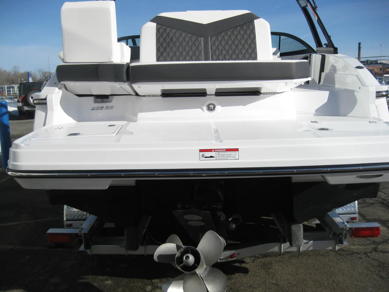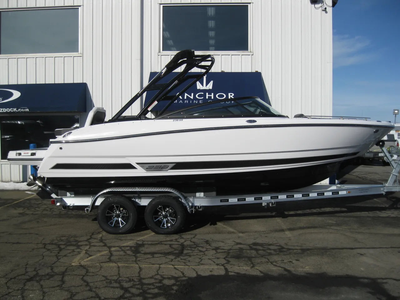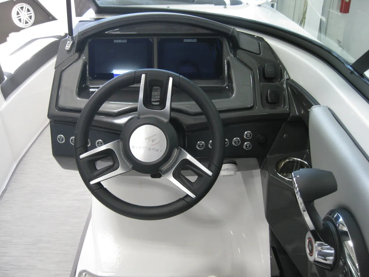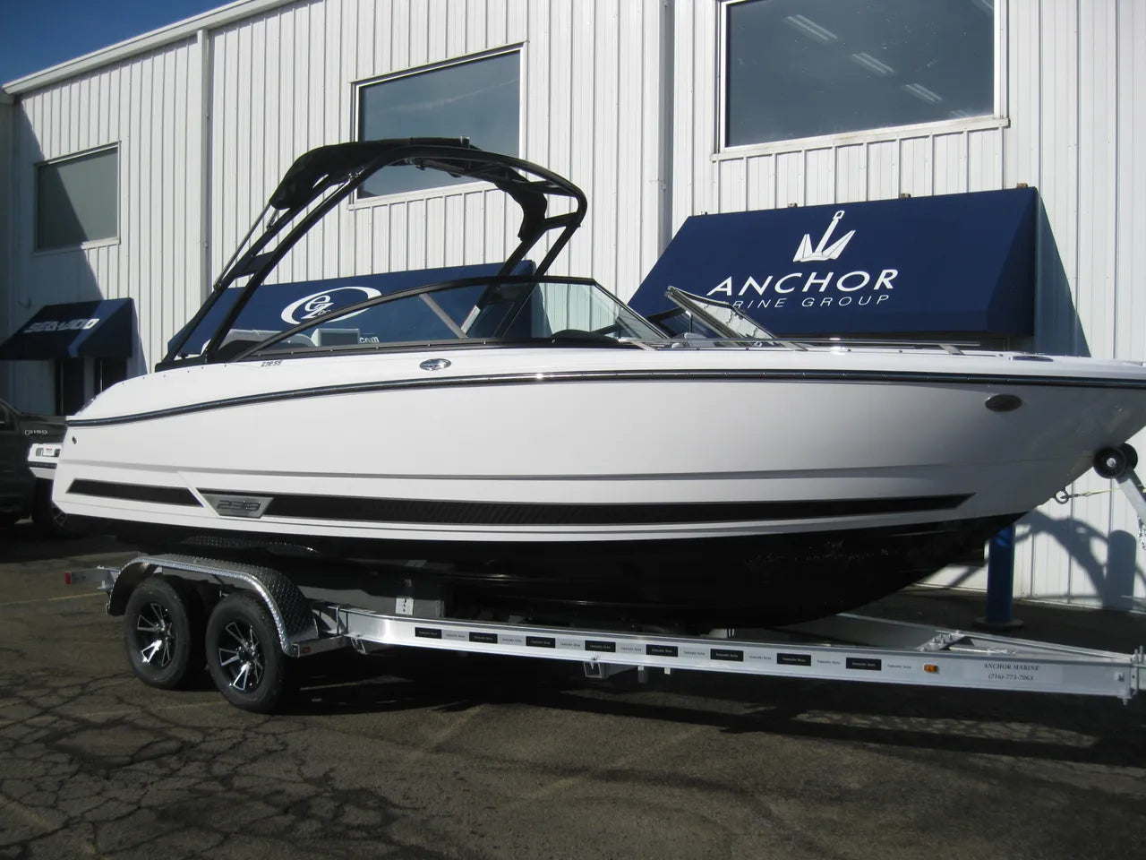 2025 Monterey 238 SS. Very popular 23' sport boat, powered by the Mercury 4.5L 250hp I/O with DTS (digital throttle and shift) and Bravo III Outdrive. Onyx #2 colors w/ black hullside bottom, anthracite upholstery, black wakeboard tower w/ integrated bimini top, twin Simrad touchscreen MFD's w/ engine data integration, Fusion bluetooth stereo system, snap out woven flooring, cockpit table, bow & cockpit covers, and comes with a Venture tandem axle aluminum trailer.
