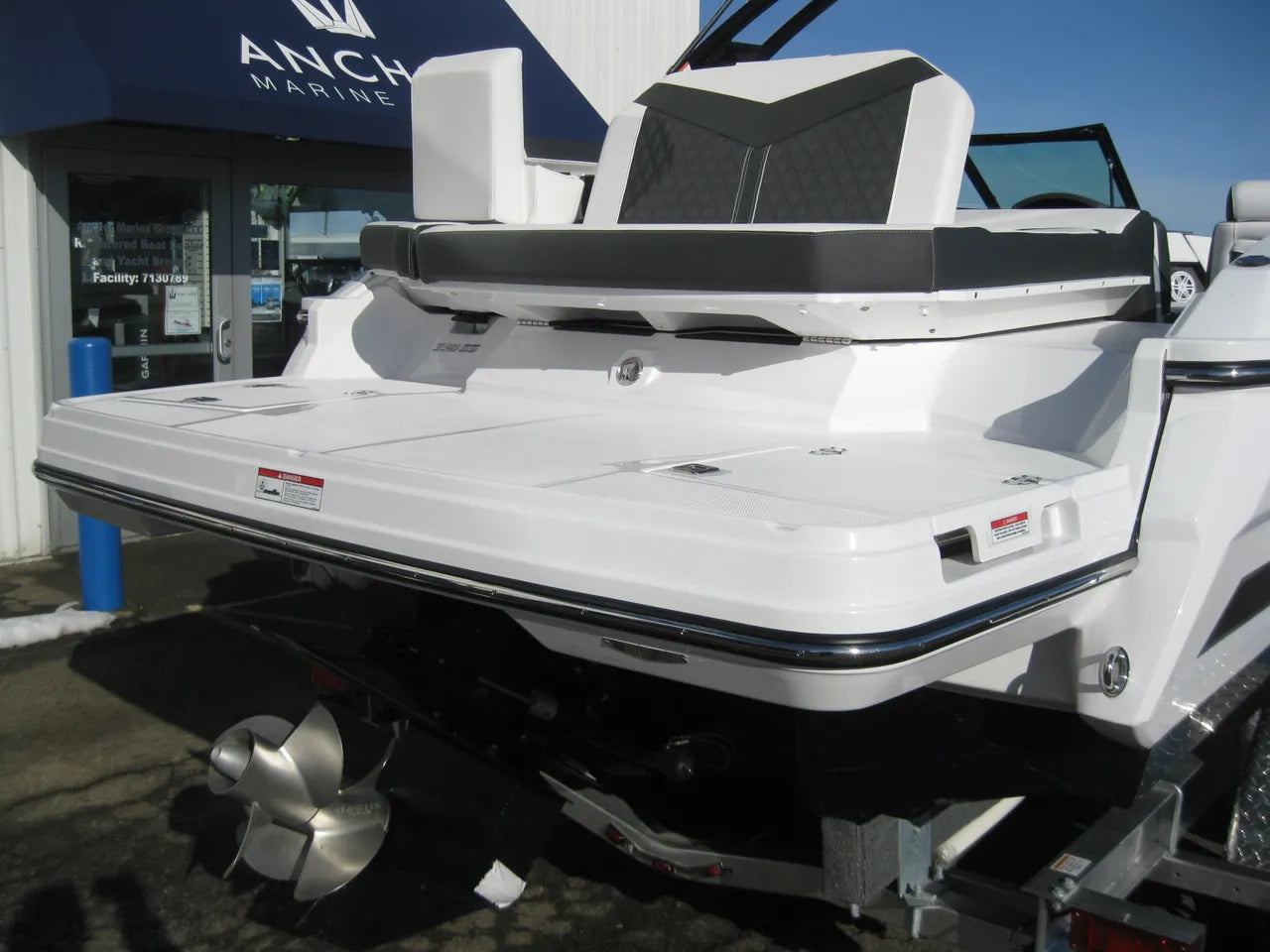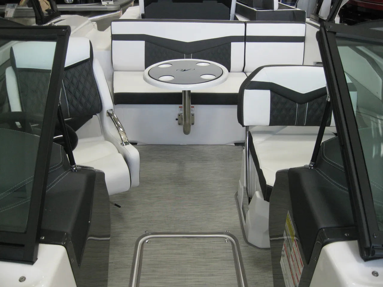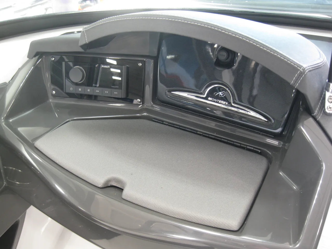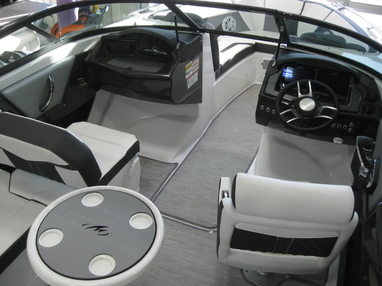 2025 Monterey 238 SS. Very popular 23' sport boat, powered by the Mercury 4.5L 250hp I/O with DTS (digital throttle and shift) and Bravo III Outdrive. Onyx #2 colors w/ black hullside bottom, anthracite upholstery, black wakeboard tower w/ integrated bimini top, twin Simrad touchscreen MFD's w/ engine data integration, Fusion bluetooth stereo system, snap out woven flooring, cockpit table, bow & cockpit covers, and comes with a Venture tandem axle aluminum trailer.