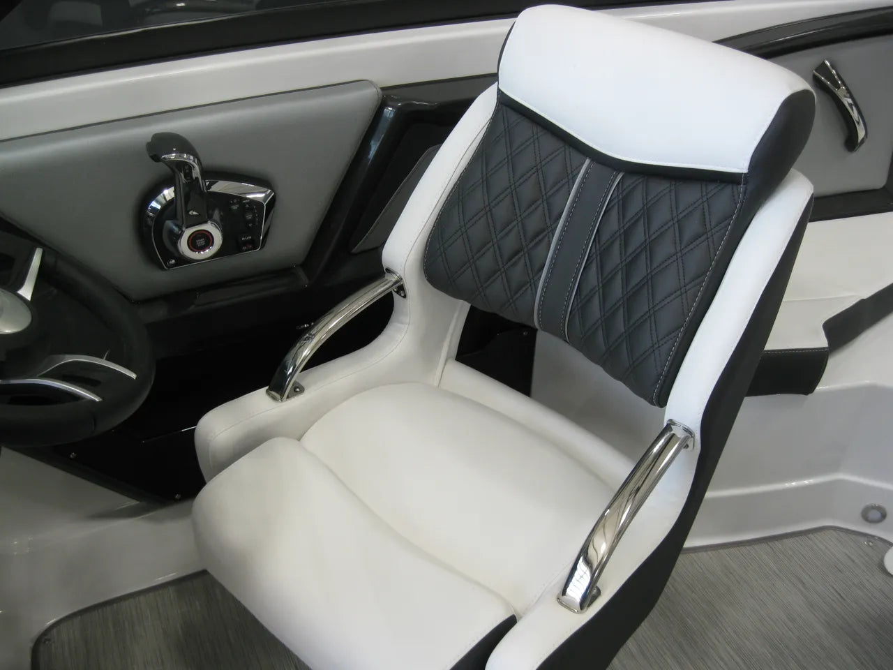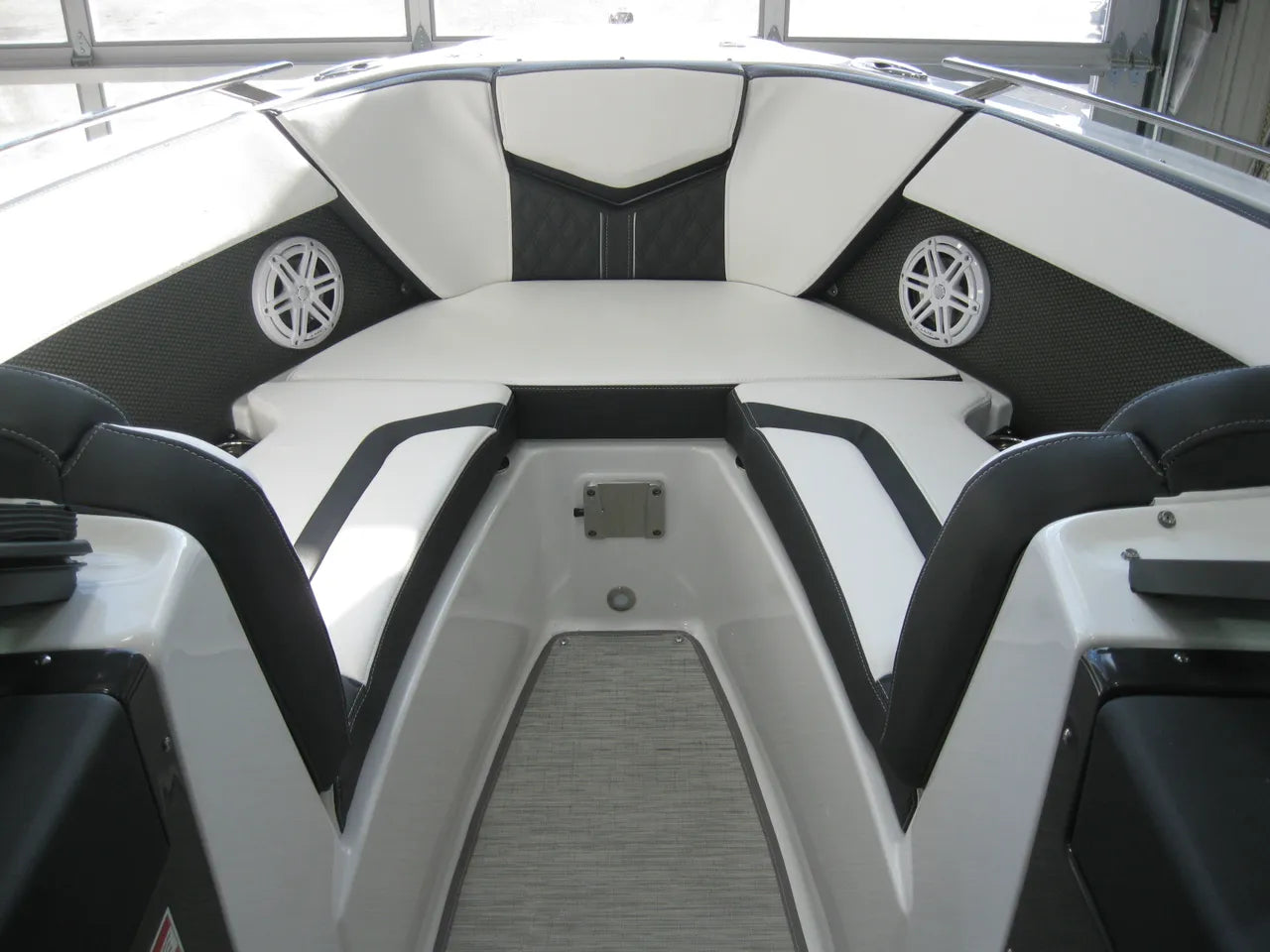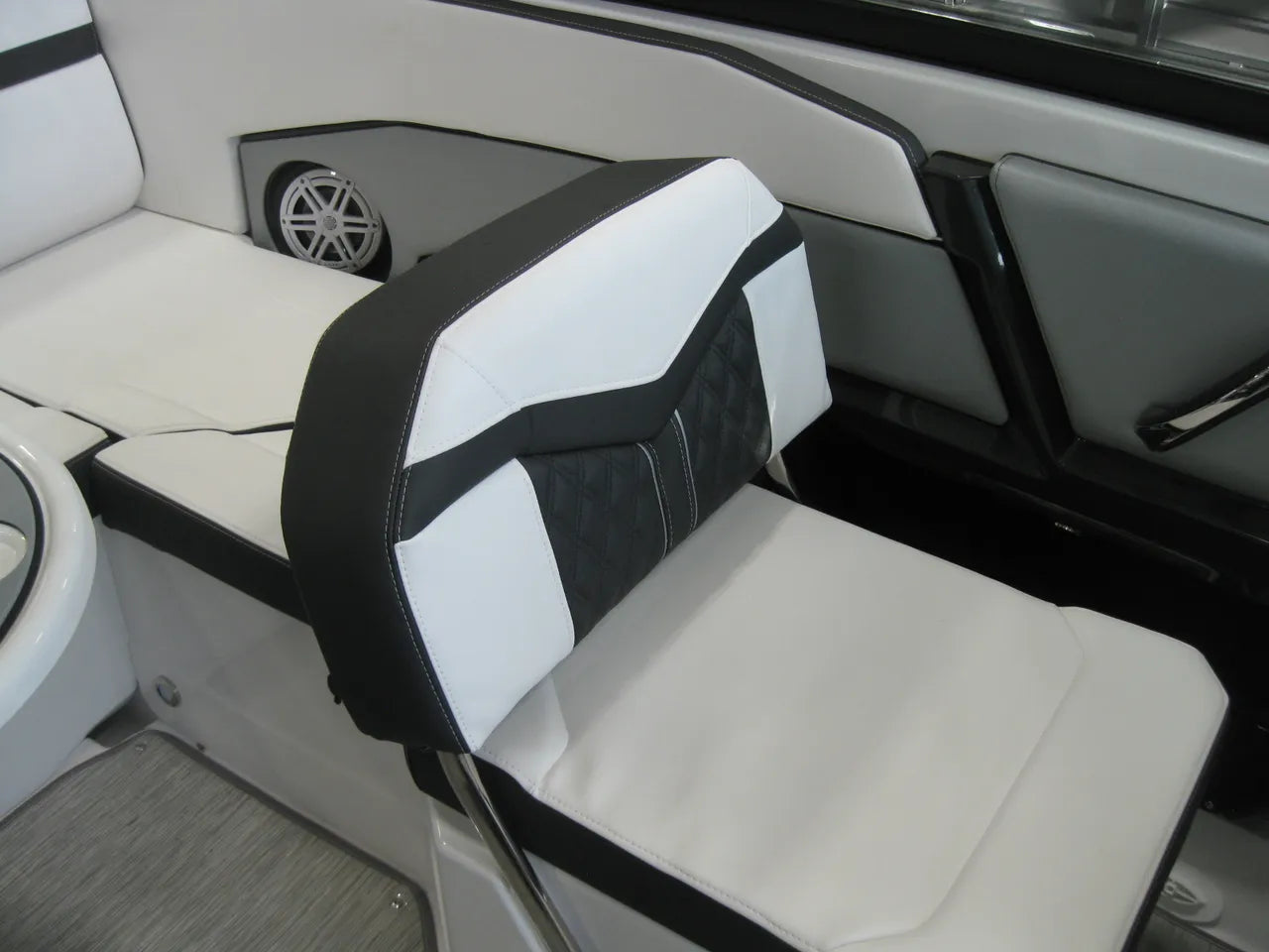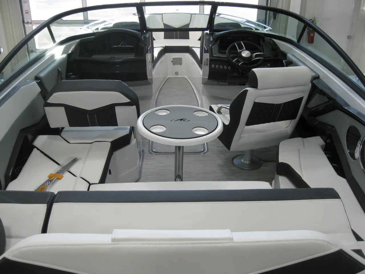 2025 Monterey 238 SS. Very popular 23' sport boat, powered by the Mercury 4.5L 250hp I/O with DTS (digital throttle and shift) and Bravo III Outdrive. Onyx #2 colors w/ black hullside bottom, anthracite upholstery, black wakeboard tower w/ integrated bimini top, twin Simrad touchscreen MFD's w/ engine data integration, Fusion bluetooth stereo system, snap out woven flooring, cockpit table, bow & cockpit covers, and comes with a Venture tandem axle aluminum trailer.