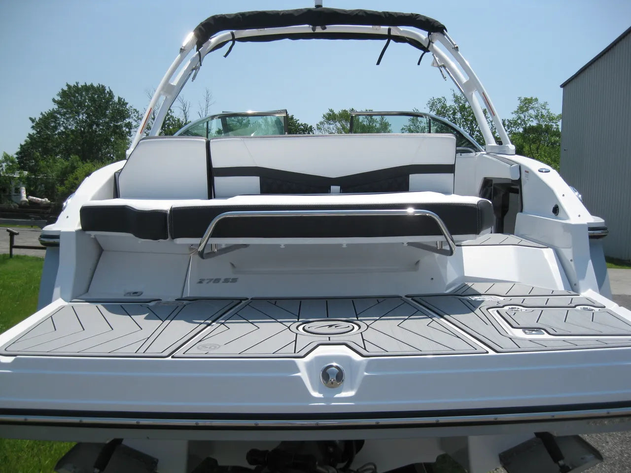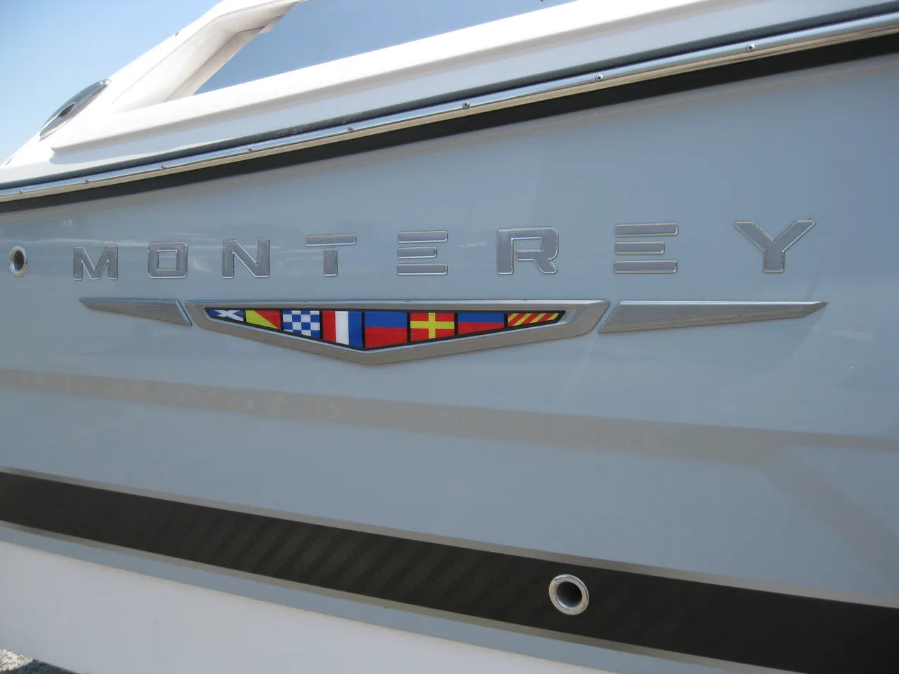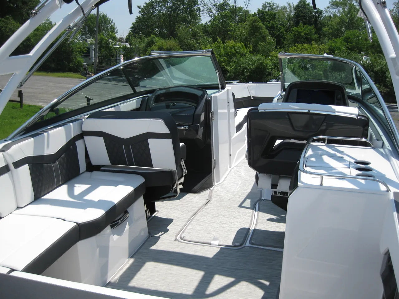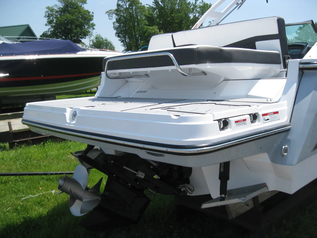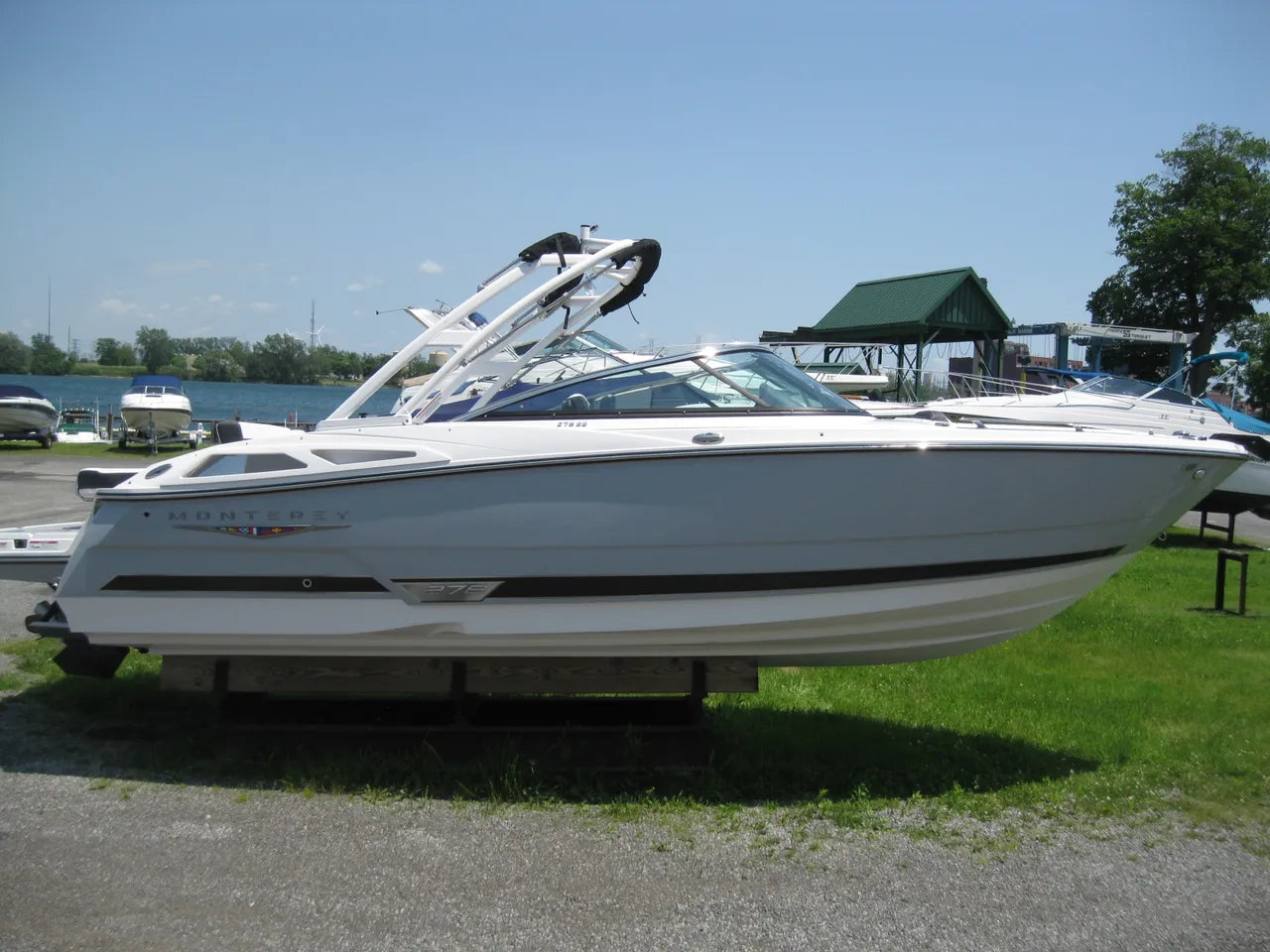2025 Monterey 278 SS.  Very popular boat for the Great Lakes, this 278 Super Sport is powered by a Mercury 6.2L 350hp w/ DTS and paired with a Bravo III Drive.  Whisper gray hullside color, arctic bottom, collapsable white wakeboard tower w/ integrated bimini top, anthracite upholstery, anchor windlass, SeaDek swim platform inlay, cockpit table, cockpit galley w/ wetbar and sink, snap out woven flooring, pumpout head, bow & cockpit covers, and more.