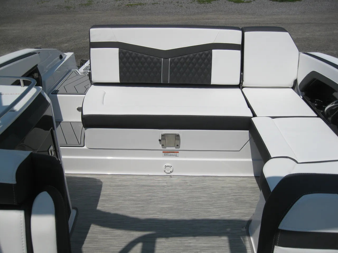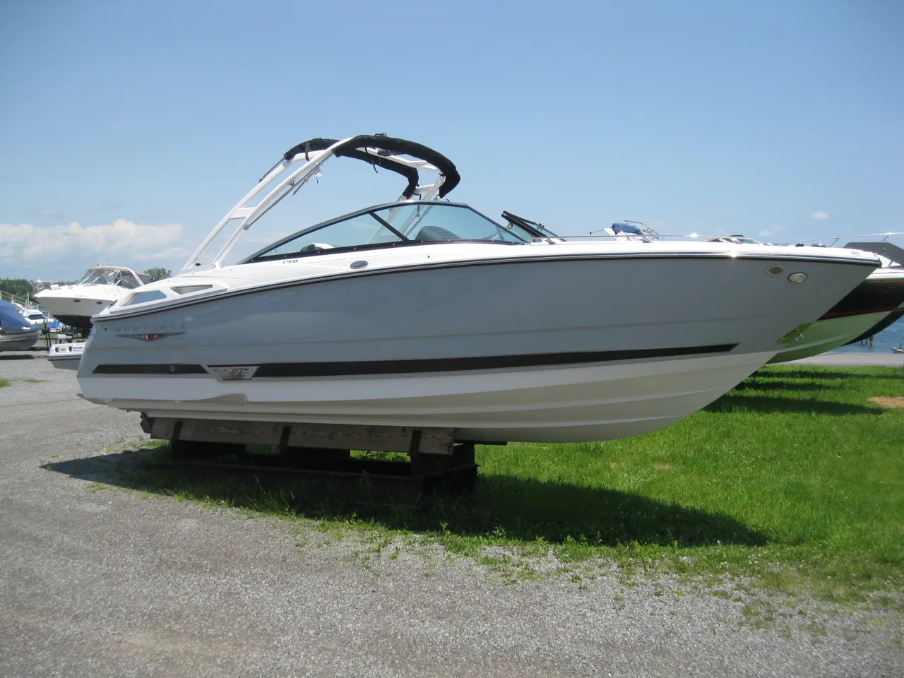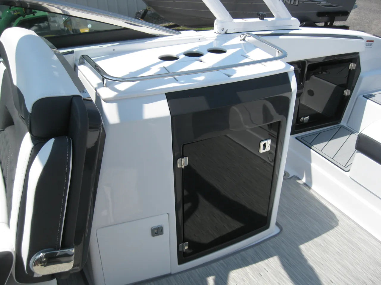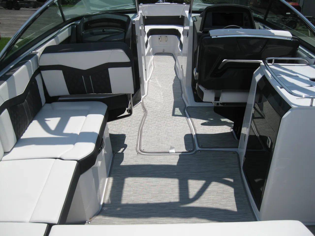 2025 Monterey 278 SS.  Very popular boat for the Great Lakes, this 278 Super Sport is powered by a Mercury 6.2L 350hp w/ DTS and paired with a Bravo III Drive.  Whisper gray hullside color, arctic bottom, collapsable white wakeboard tower w/ integrated bimini top, anthracite upholstery, anchor windlass, SeaDek swim platform inlay, cockpit table, cockpit galley w/ wetbar and sink, snap out woven flooring, pumpout head, bow & cockpit covers, and more.
