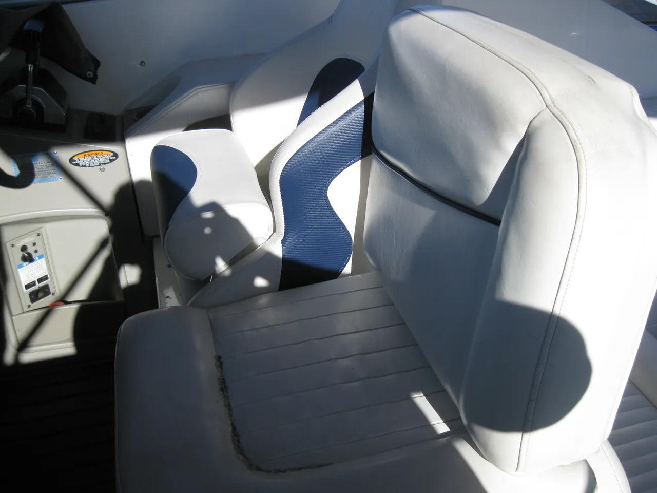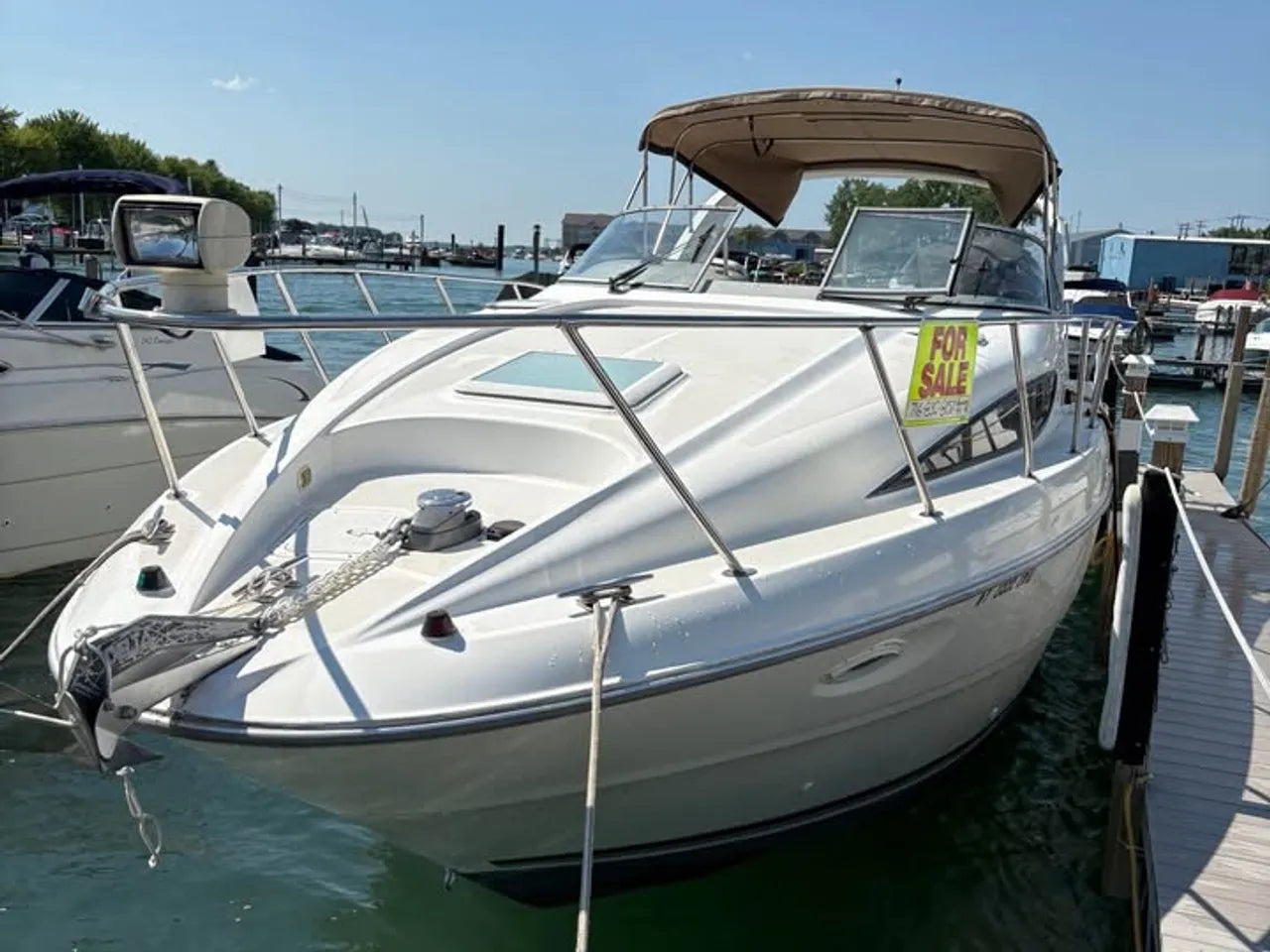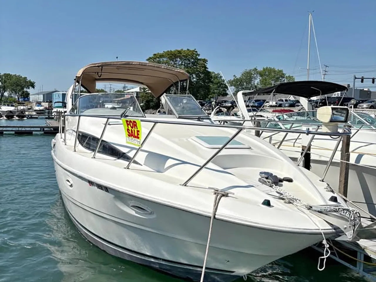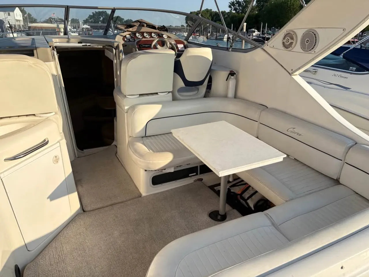 2000 Bayliner 3055 Ciera. 30' twin engine express cruiser, powered by twin Mercuiser 5.0L v8's. Large extended swim platform leads to a port side entry to the cockpit, with fresh water sink, "L" group seating w/ cockpit table, marine mat flooring, new helm captains chair w/ flip up bolster, trim tabs, depth finder, VHF radio, air conditioning w/ reverse cycle heat, kitchenette w/ stovetop, microwave, fridge and sink, anchor windlass, marine head w/ holding tank, and new camper top canvas w/ isinglass.