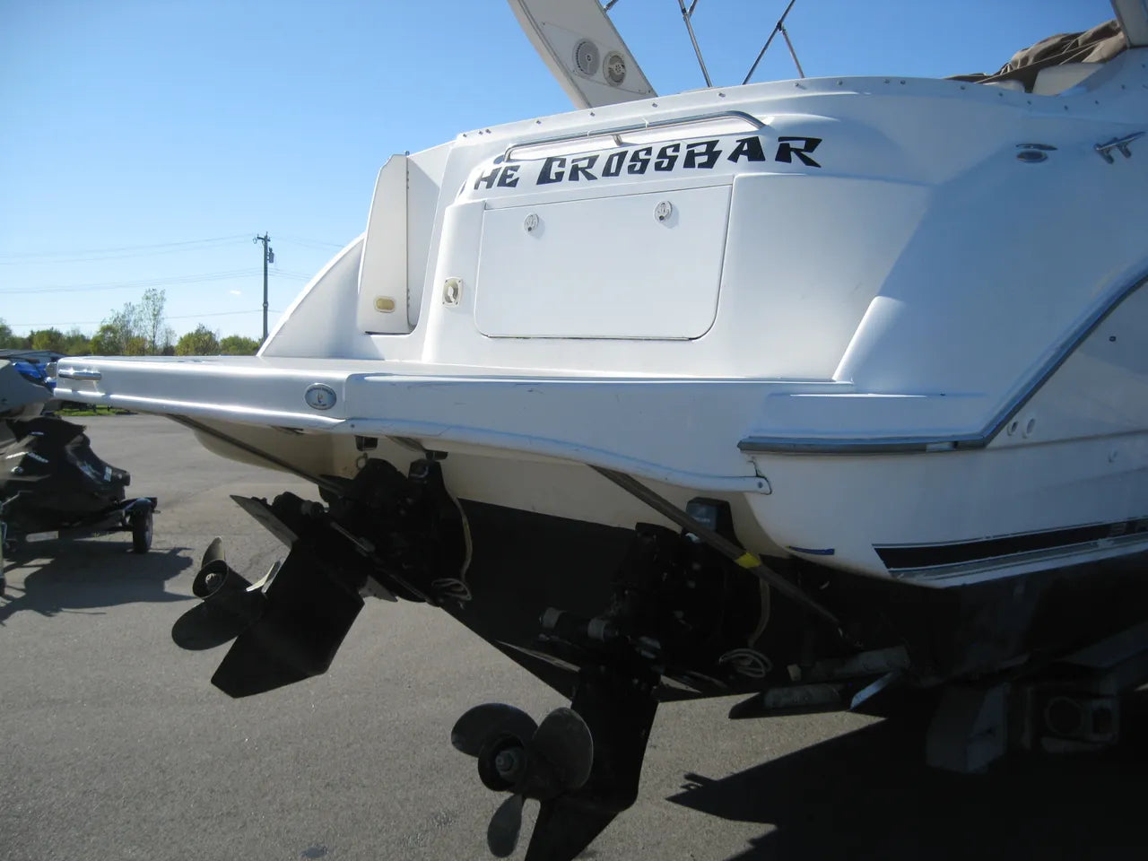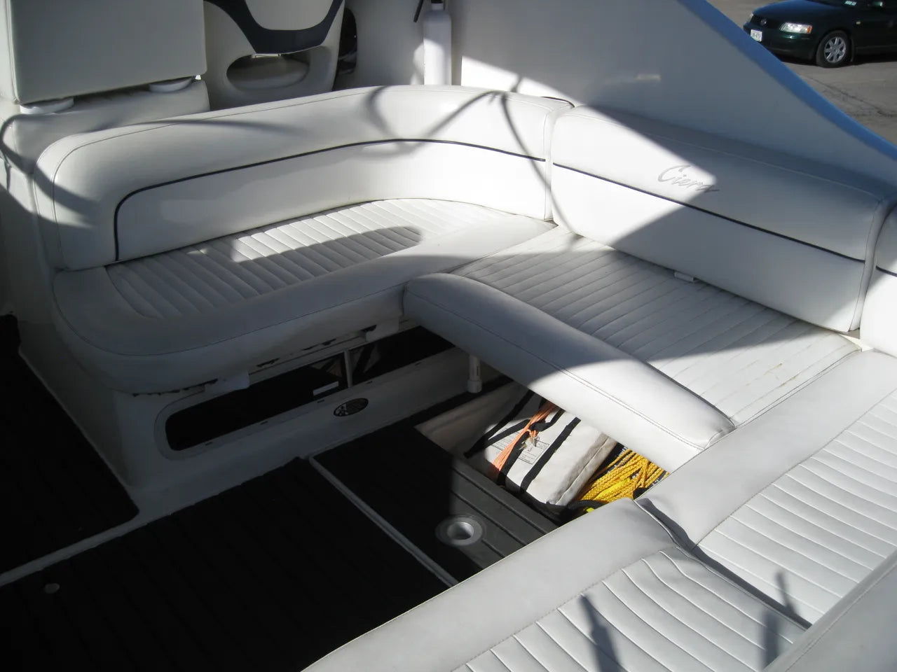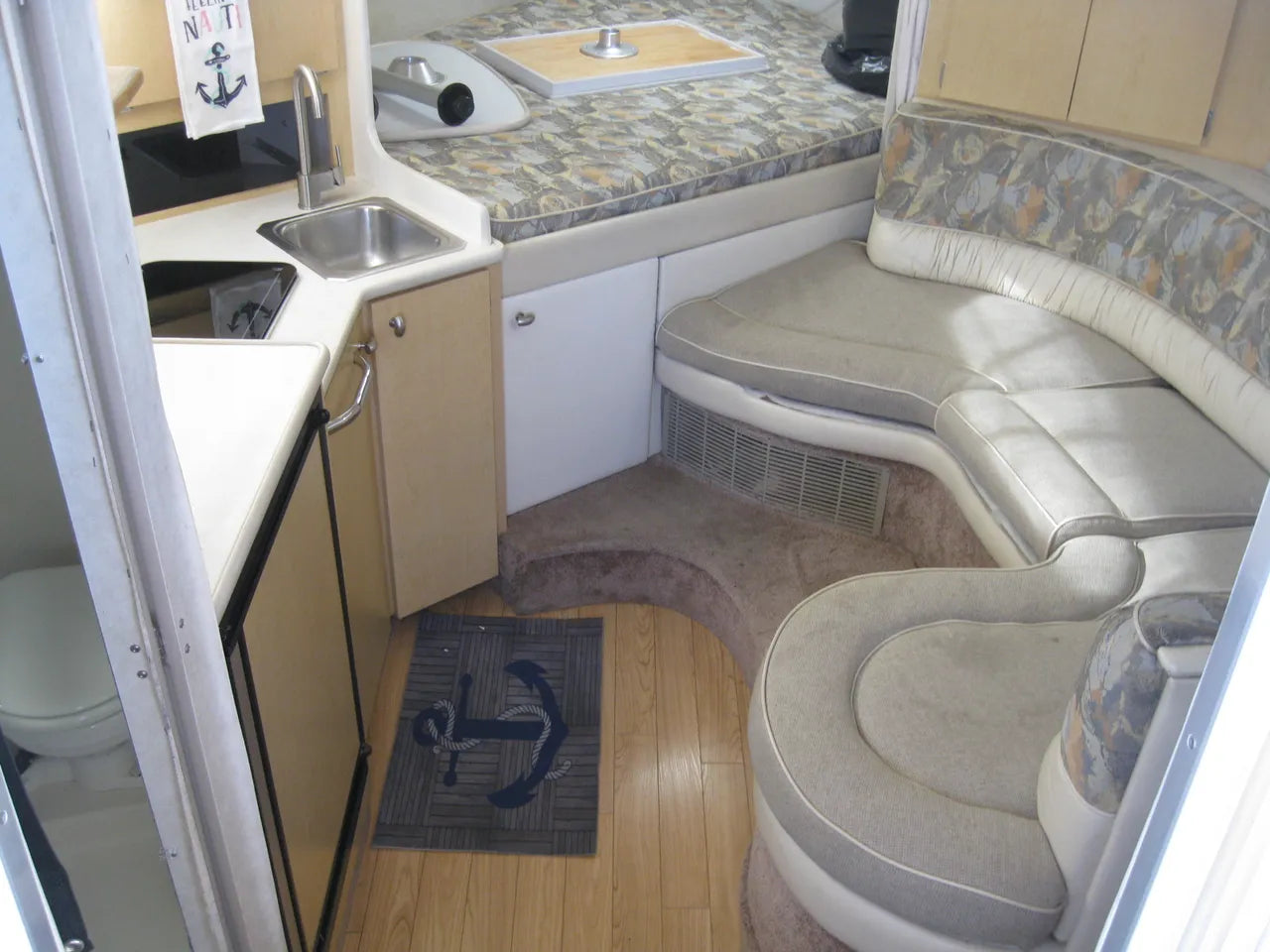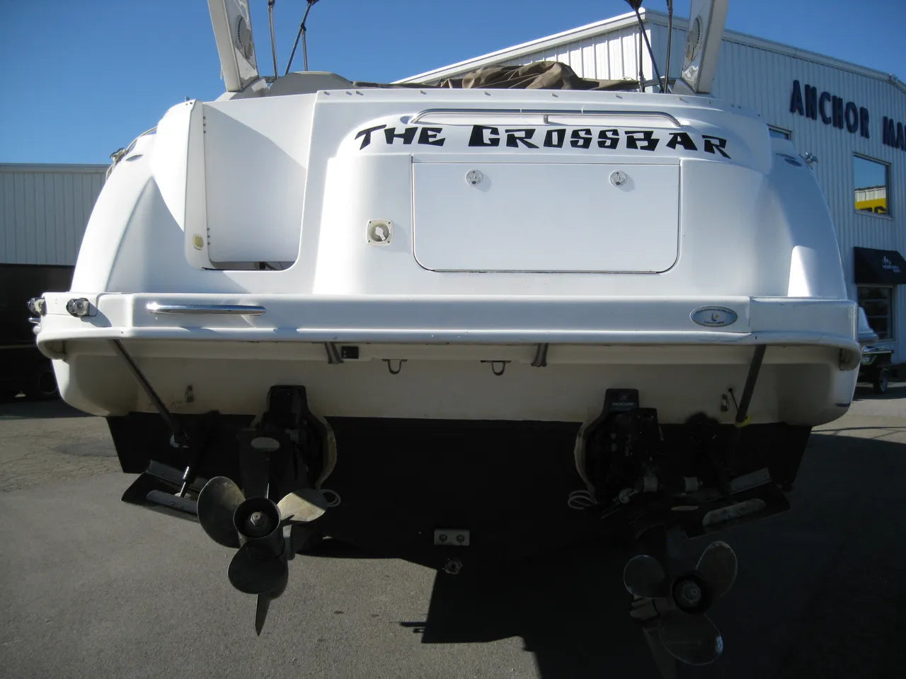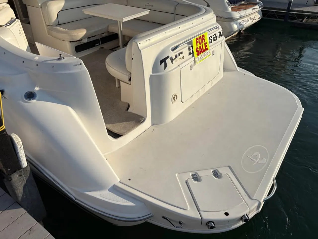 2000 Bayliner 3055 Ciera. 30' twin engine express cruiser, powered by twin Mercuiser 5.0L v8's. Large extended swim platform leads to a port side entry to the cockpit, with fresh water sink, "L" group seating w/ cockpit table, marine mat flooring, new helm captains chair w/ flip up bolster, trim tabs, depth finder, VHF radio, air conditioning w/ reverse cycle heat, kitchenette w/ stovetop, microwave, fridge and sink, anchor windlass, marine head w/ holding tank, and new camper top canvas w/ isinglass.