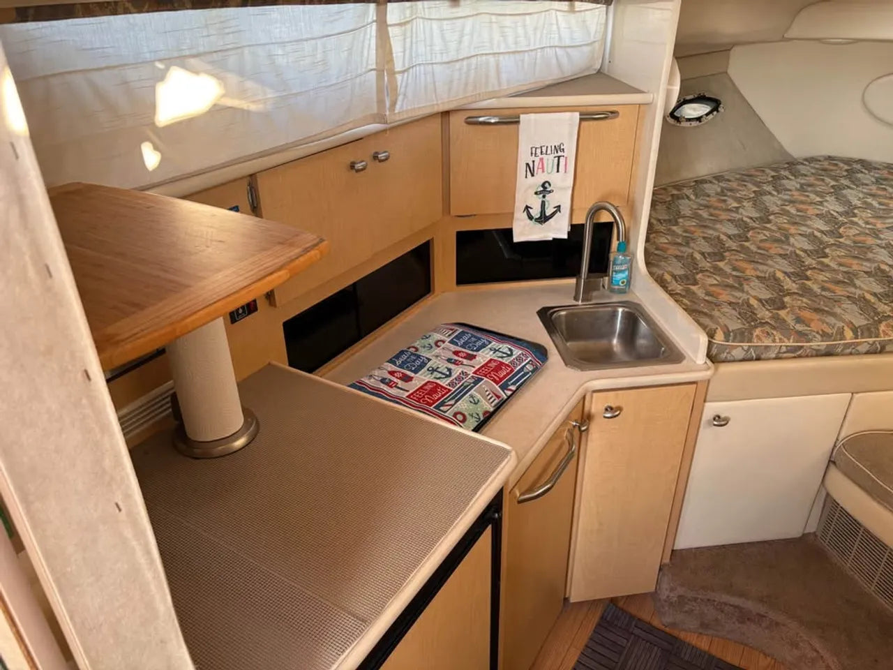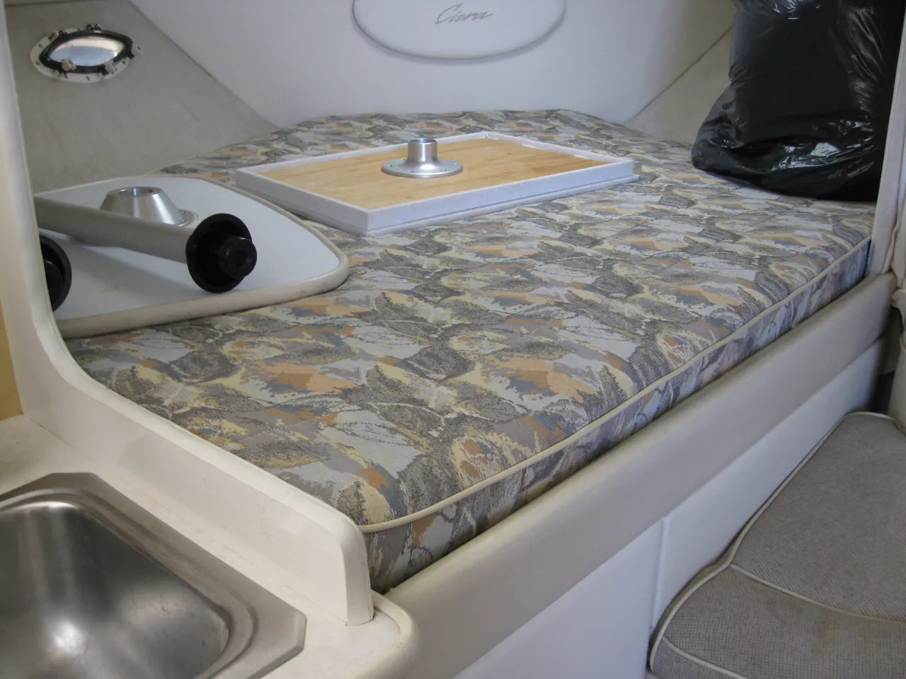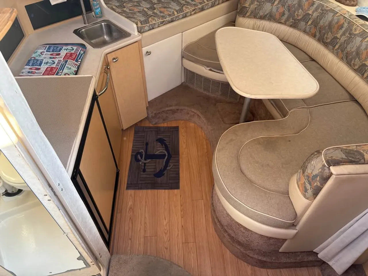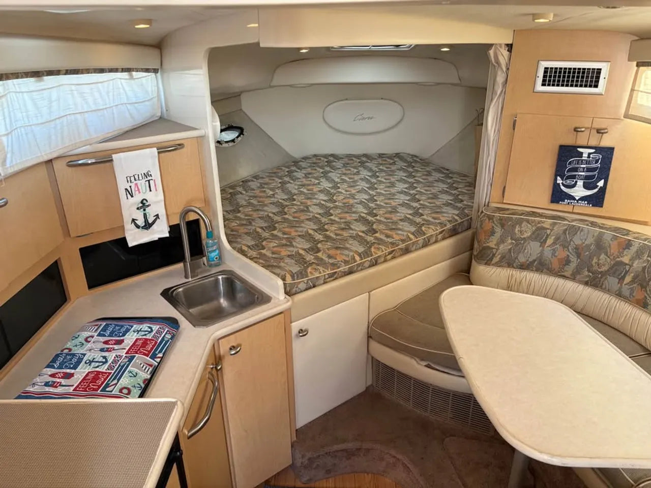 2000 Bayliner 3055 Ciera. 30' twin engine express cruiser, powered by twin Mercuiser 5.0L v8's. Large extended swim platform leads to a port side entry to the cockpit, with fresh water sink, "L" group seating w/ cockpit table, marine mat flooring, new helm captains chair w/ flip up bolster, trim tabs, depth finder, VHF radio, air conditioning w/ reverse cycle heat, kitchenette w/ stovetop, microwave, fridge and sink, anchor windlass, marine head w/ holding tank, and new camper top canvas w/ isinglass.