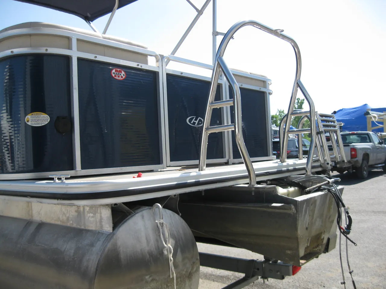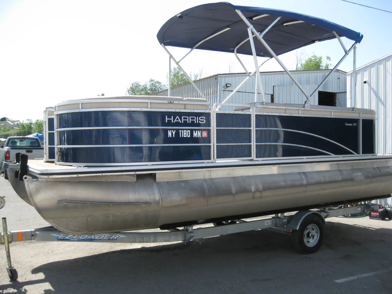 2016 Harris 200 CX. 21' pontoon boat, NO MOTOR. Has controls / harness / steering / throttle and shift cables for a Mercury Engine. CW center walkthrough layout, upgraded flooring (no carpet) helm reclining captains chair, stereo, bimini top, stainless steel ski tow bar and comes with a trailer.