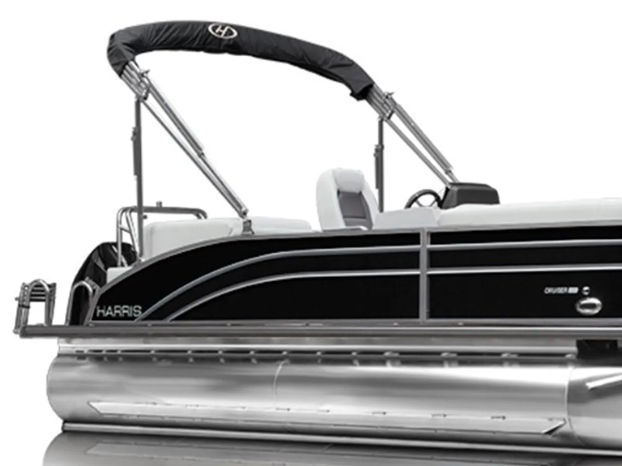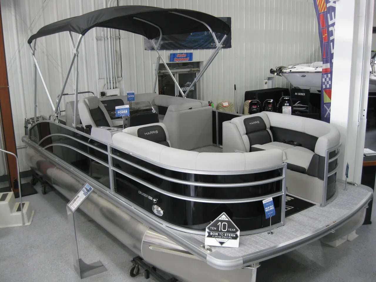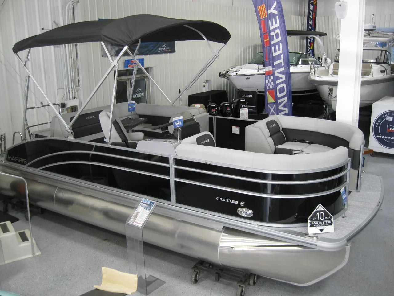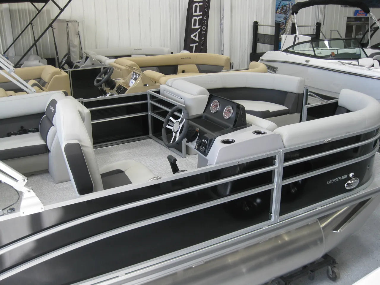 2024 Harris 210 Cruiser CS. CS layout, powered by a Mercury 60hp Command Thrust 4 stroke. Ebony metallic side panels, tungsten interior, 225 chasis, lifting strakes, Xtreme tilt steering upgrade, ss 4 step ladder, ski tow bar, helm Ultralux recliner, changing room, stone gray flooring, removable windscreen, digital depth finder, battery on off switch, ss flip up cleats, docking lights, quick release fender system, woodgrain sport table upgrade, oversized bimini, and full mooring cover.
