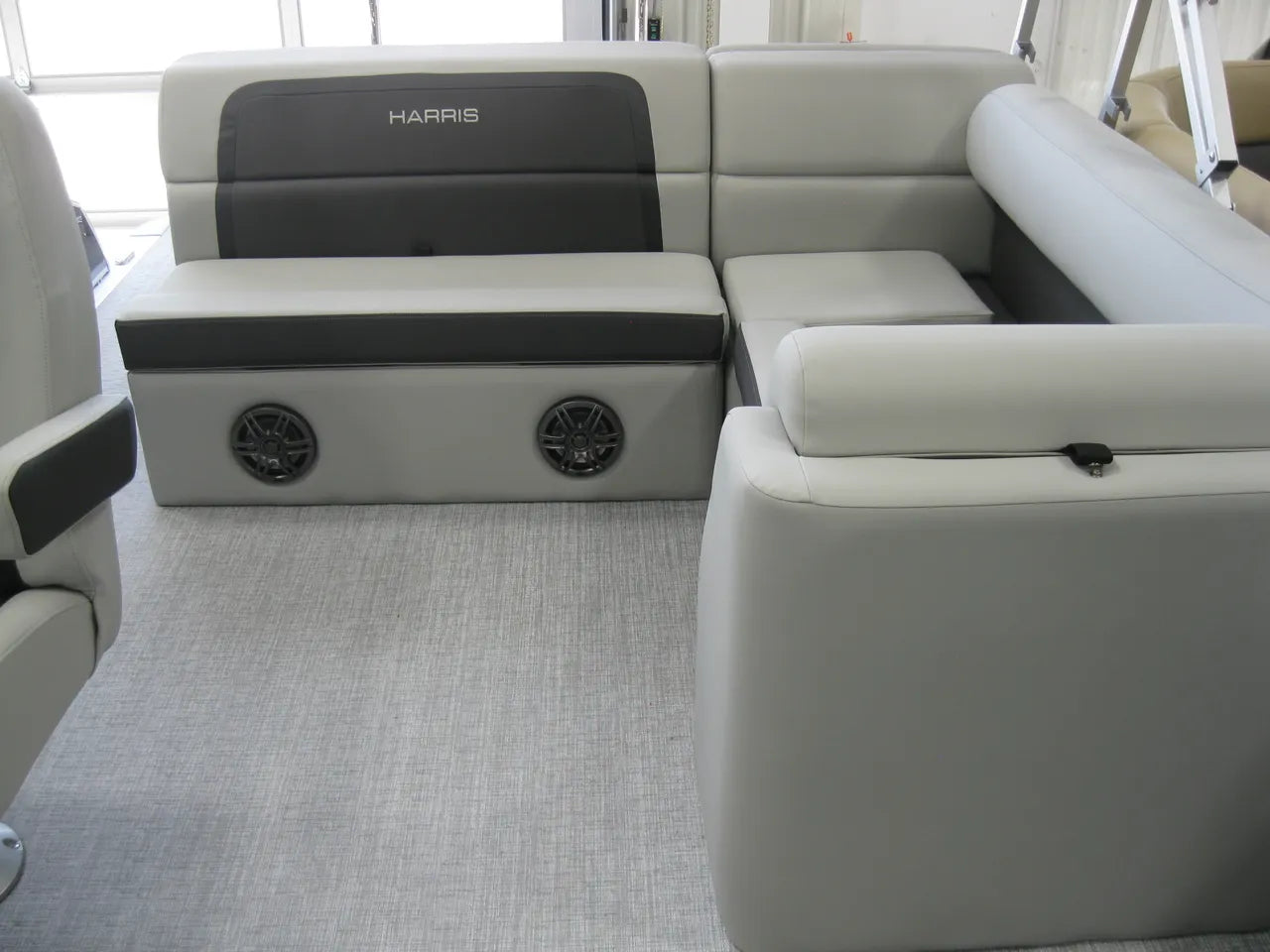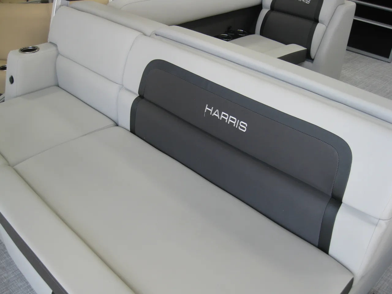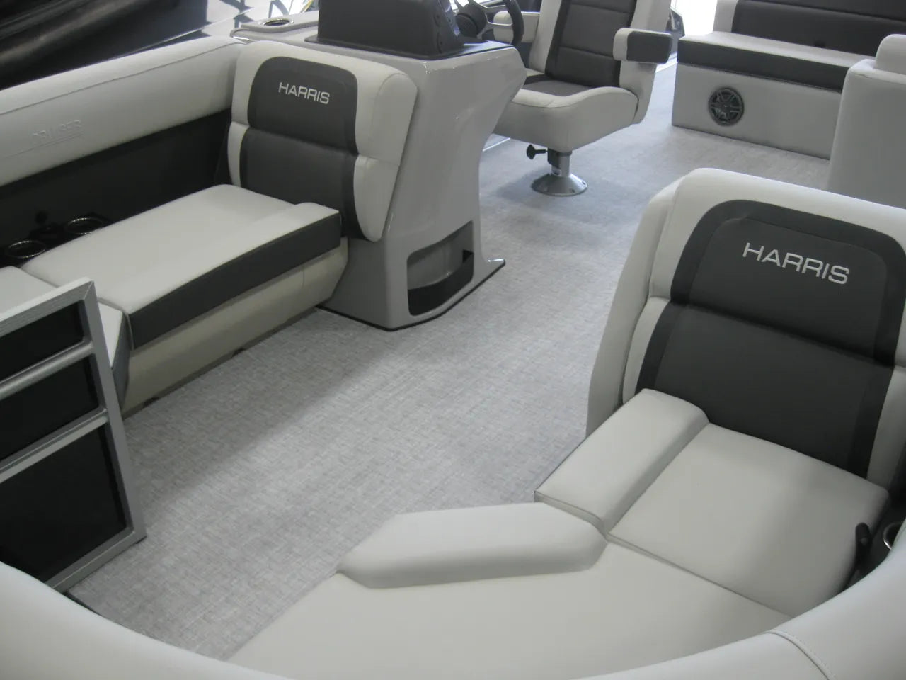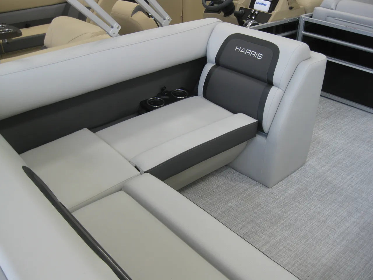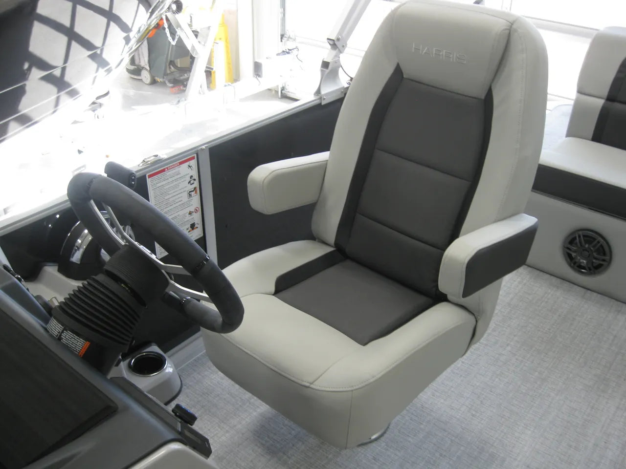 2024 Harris 210 Cruiser CS. CS layout, powered by a Mercury 60hp Command Thrust 4 stroke. Ebony metallic side panels, tungsten interior, 225 chasis, lifting strakes, Xtreme tilt steering upgrade, ss 4 step ladder, ski tow bar, helm Ultralux recliner, changing room, stone gray flooring, removable windscreen, digital depth finder, battery on off switch, ss flip up cleats, docking lights, quick release fender system, woodgrain sport table upgrade, oversized bimini, and full mooring cover.