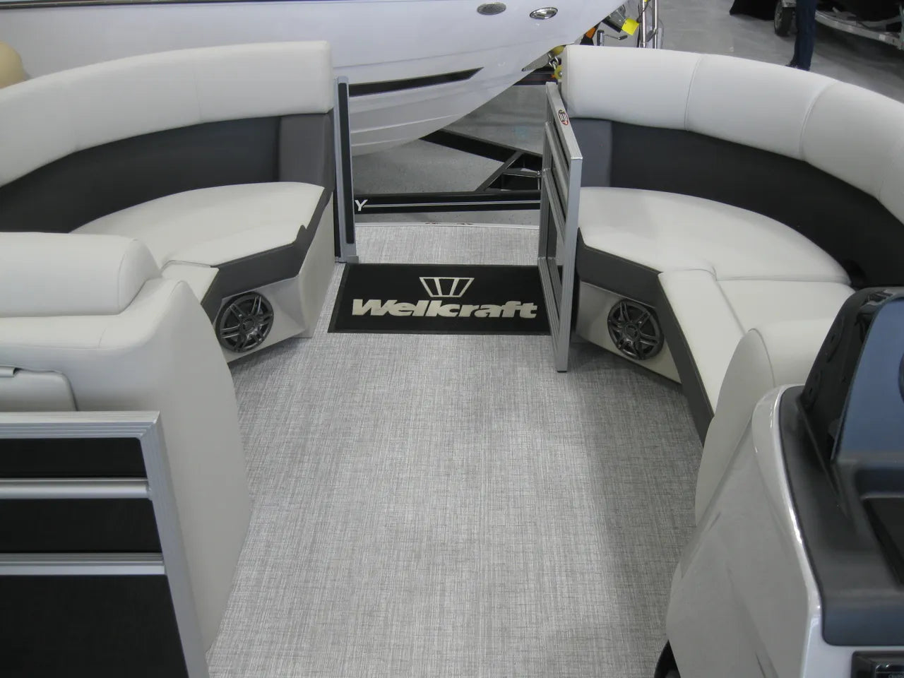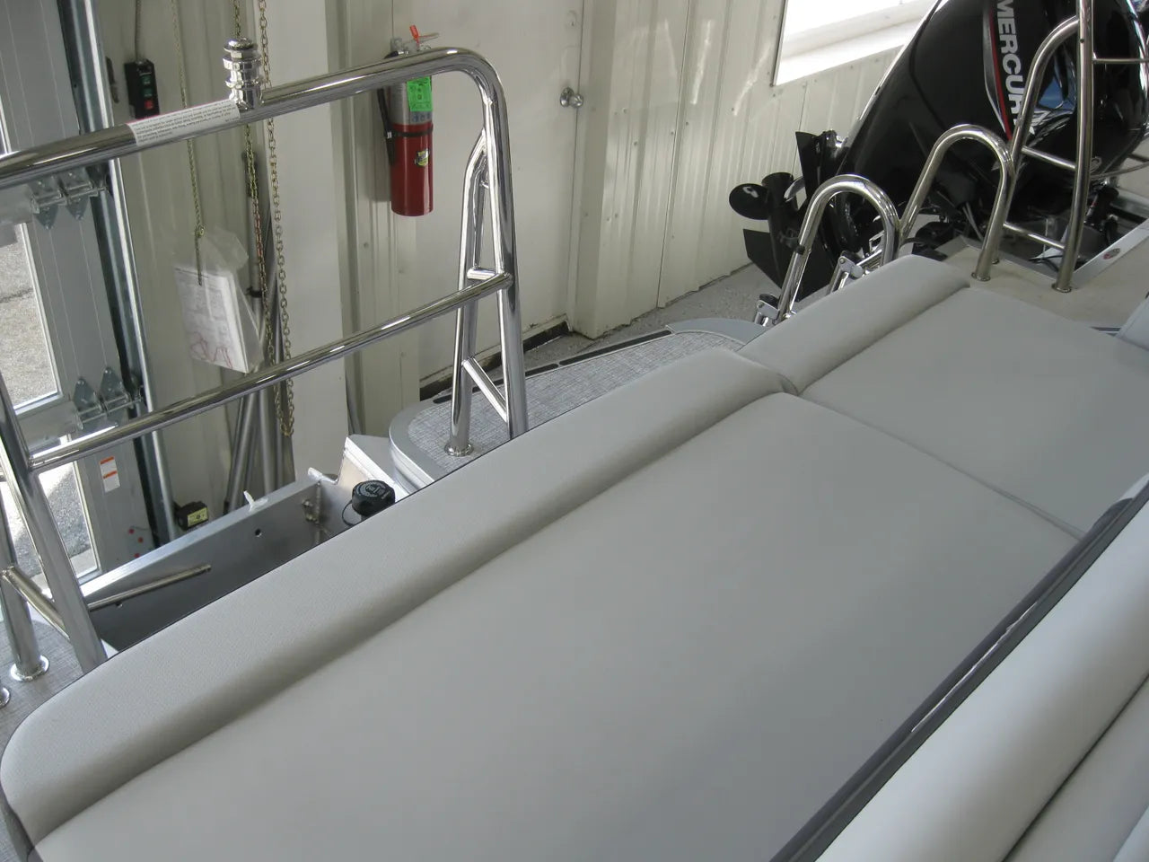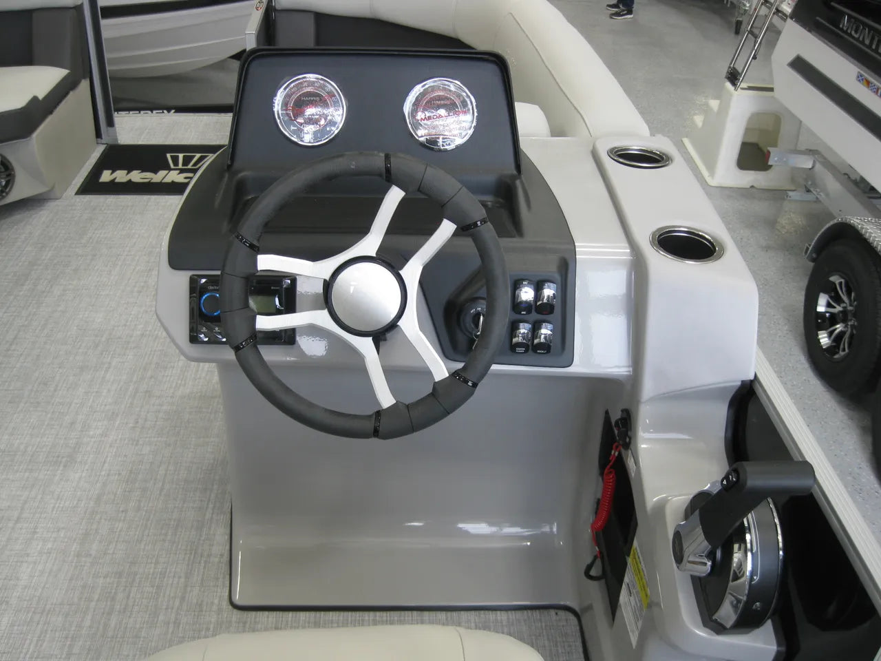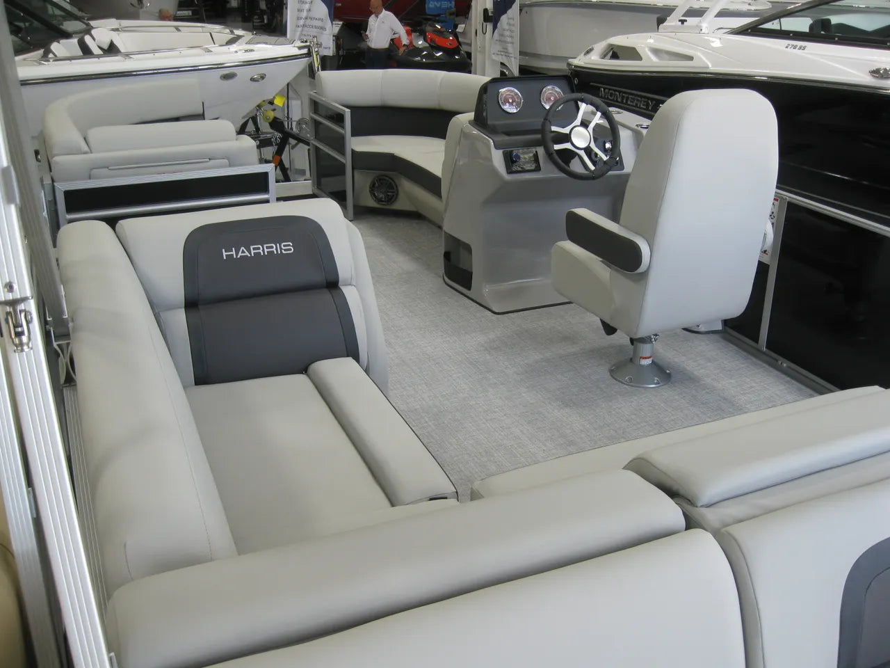 2024 Harris 210 Cruiser CS. CS layout, powered by a Mercury 60hp Command Thrust 4 stroke. Ebony metallic side panels, tungsten interior, 225 chasis, lifting strakes, Xtreme tilt steering upgrade, ss 4 step ladder, ski tow bar, helm Ultralux recliner, changing room, stone gray flooring, removable windscreen, digital depth finder, battery on off switch, ss flip up cleats, docking lights, quick release fender system, woodgrain sport table upgrade, oversized bimini, and full mooring cover.